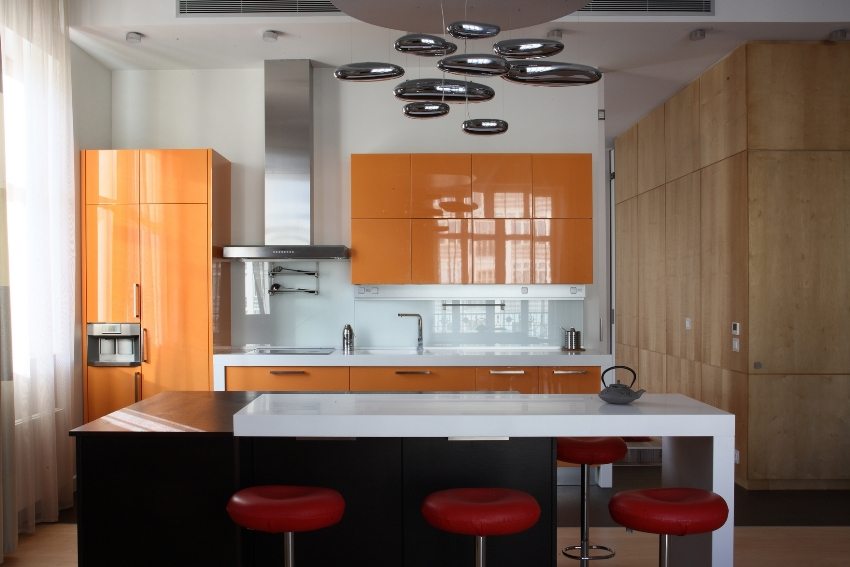 Rozwiązania kolorystyczne również mogą być różne. Jasne kolory aż do ognistej czerwieni w połączeniu z chromowanymi metalowymi detalami są dziś szczególnie popularne. Szczególnie pasuje do stylu high-tech lub minimalistycznego. Szaro-beżowy kolor nadaje wnętrzu poczucie całkowitego spokoju. W połączeniu z blatem imitującym strukturę i fakturę granitu i innych kamieni naturalnych.