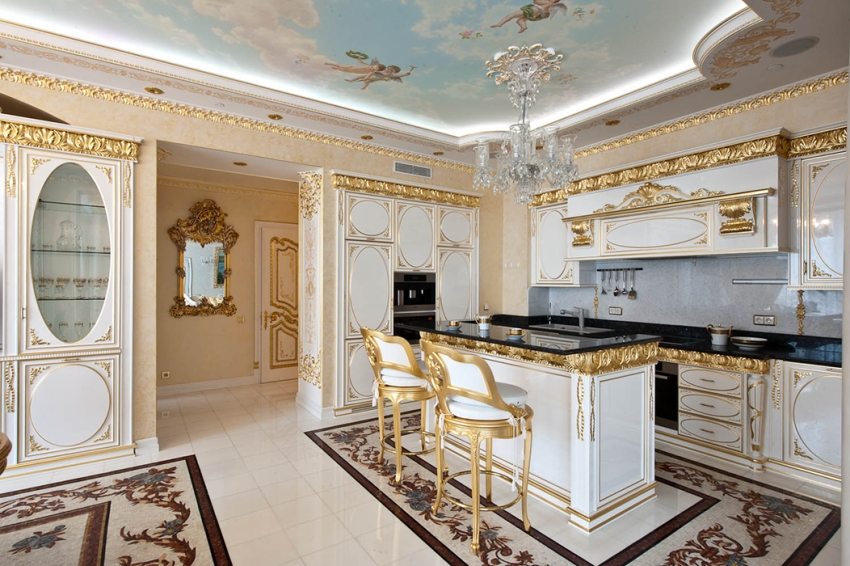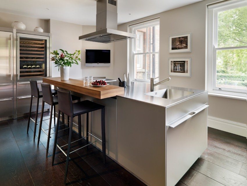 - jako podział kuchni na strefy stosuje się blat barowy wyposażony w baldachim na górze z oświetleniem. Atrybutem tego projektu jest niklowana rura łącząca blat i baldachim nad nim z podłogą. Rura ma średnicę 5-6 cm. Zainstalowane są na nim półki i zawieszenia na okulary, mające różne rozwiązania konstrukcyjne. Z jednej strony taki stojak jest połączony z szafką jednostki kuchennej, a drugi spoczywa na rurze;