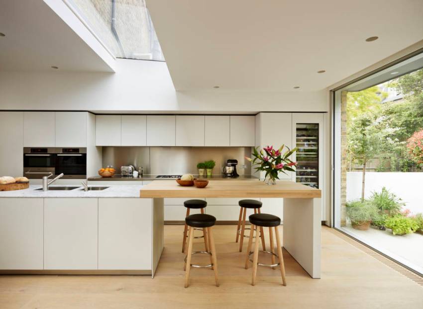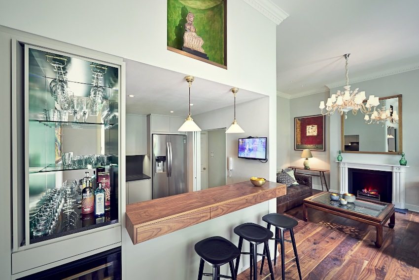 - transformatory. Są to kuchnie, w których niektóre meble można złożyć, rozłożyć i przekształcić w inne. W tych kuchniach blat barowy można złożyć lub włożyć do zestawu słuchawkowego, jeśli nie jest to konieczne, i wyjąć lub rozłożyć w razie potrzeby. To rozwiązanie jest popularne, gdy przestrzeń jest ograniczona;