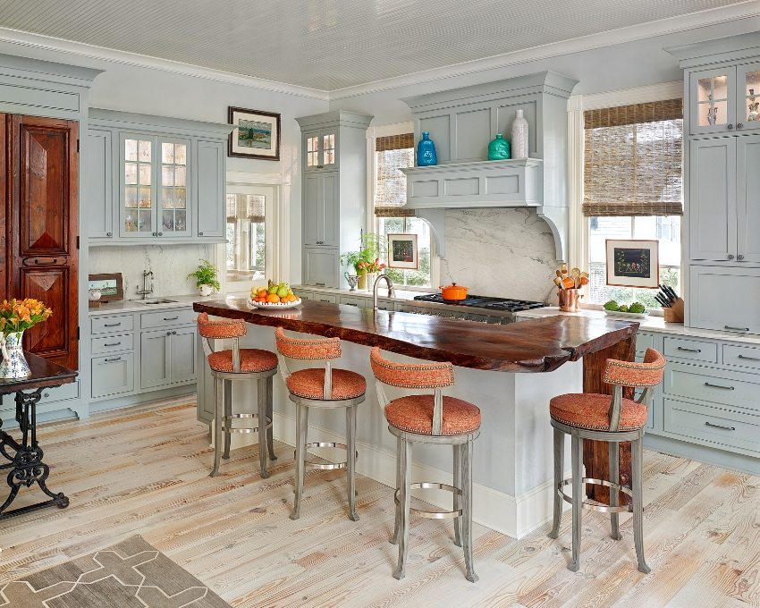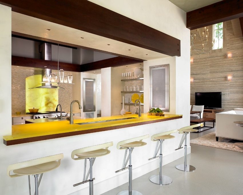 Projektując wnętrze kuchni, projektanci znajdują wiele rozwiązań dotyczących konstrukcji lady barowej. Ten element wnętrza kuchni może mieć dowolny kształt i można go znaleźć w dowolnym miejscu w pomieszczeniu. Lada barowa może być używany nie tylko zgodnie z jego przeznaczeniem, ale także służyć jako swego rodzaju bariera rozdzielająca pomieszczenia na strefy.