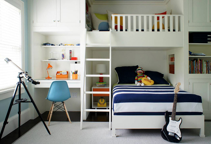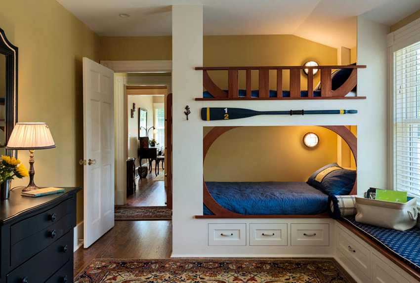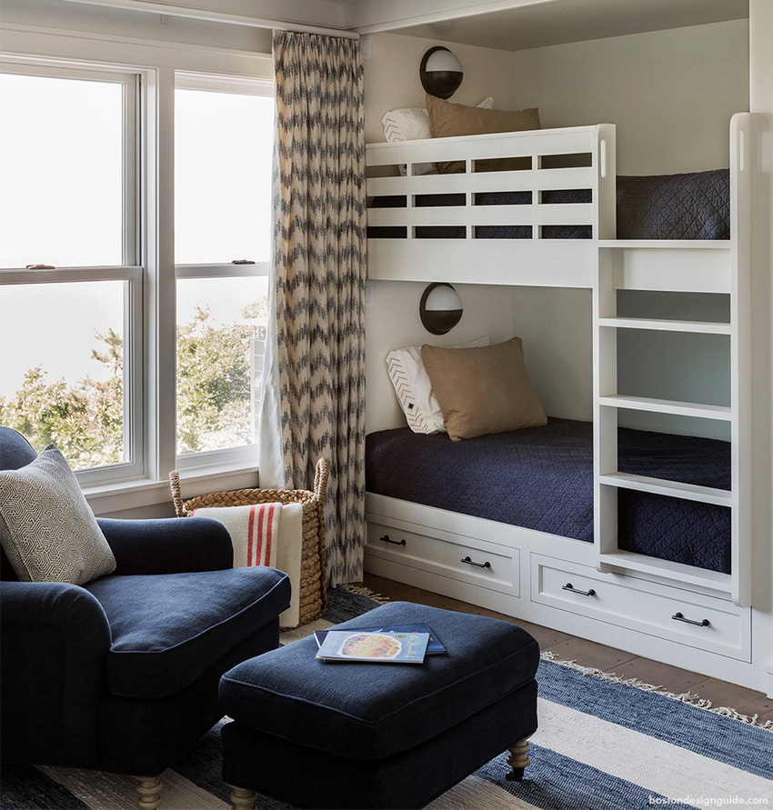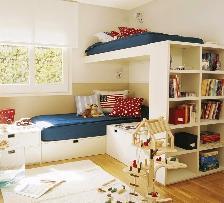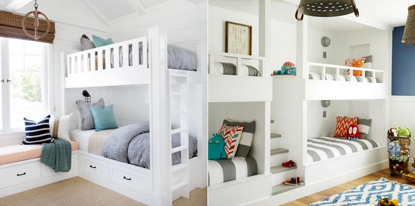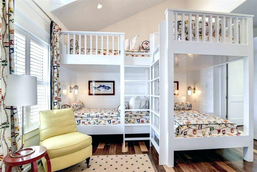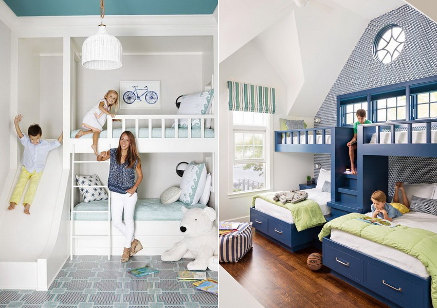 Miejsca do spania mogą być ustawione prostopadle do siebie lub poprzecznie.Ta opcja daje upust wyobraźni do organizacji przestrzeni nocnej, którą można łatwo uzupełnić innymi modułami mebli. Tutaj możesz wyposażyć miejsce pracy w biurko, zorganizować system przechowywania książek, zabawek, ubrań i innych rzeczy. Ciekawe pomysły na aranżację przestrzeni nocnej pokazano na zdjęciu pokoje dziecięce z łóżkiem piętrowym.