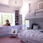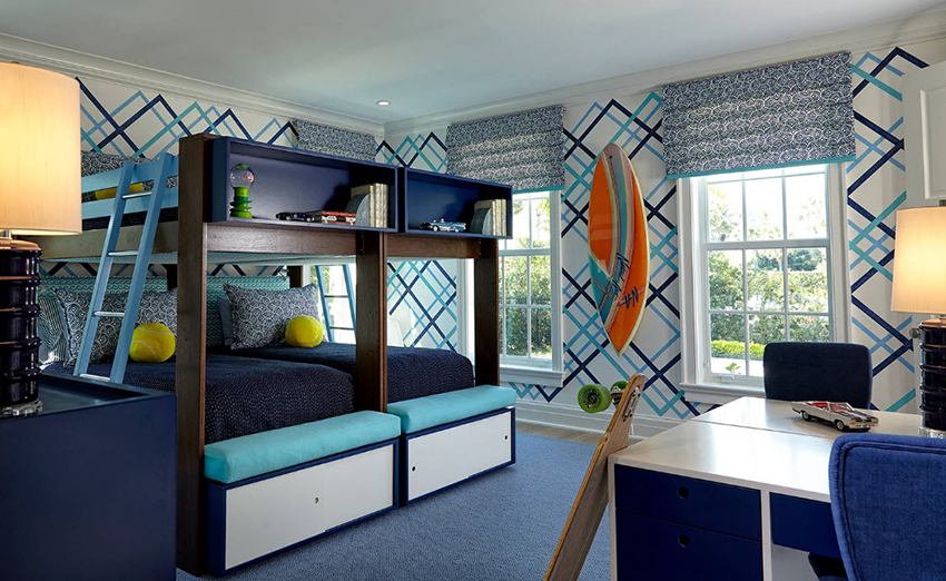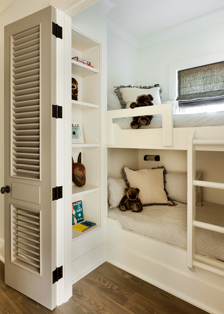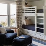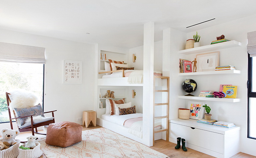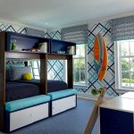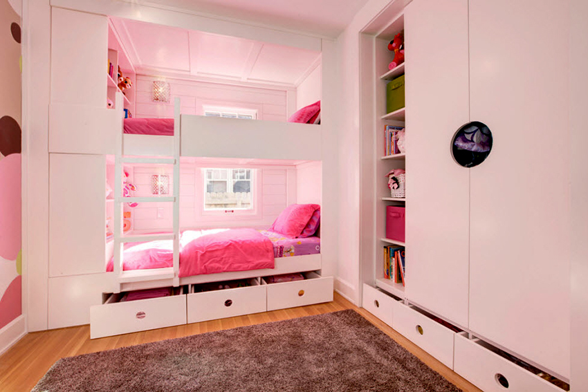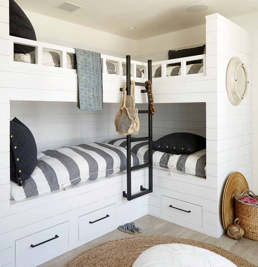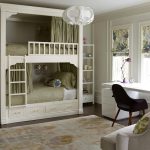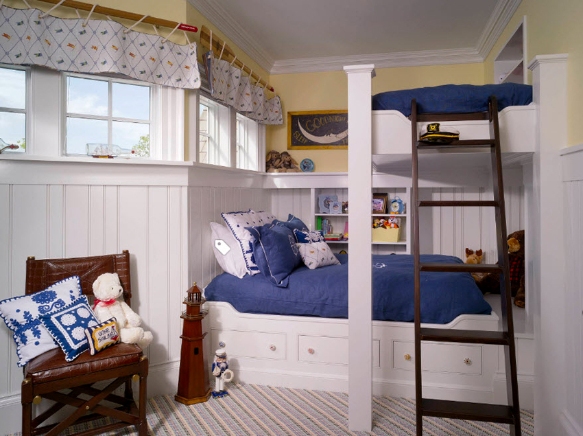 Miejsca do spania mogą być ustawione prostopadle do siebie lub poprzecznie.Ta opcja daje upust wyobraźni do organizacji przestrzeni nocnej, którą można łatwo uzupełnić innymi modułami mebli. Tutaj możesz wyposażyć miejsce pracy w biurko, zorganizować system przechowywania książek, zabawek, ubrań i innych rzeczy. Ciekawe pomysły na aranżację przestrzeni nocnej pokazano na zdjęciu pokoje dziecięce z łóżkiem piętrowym.
