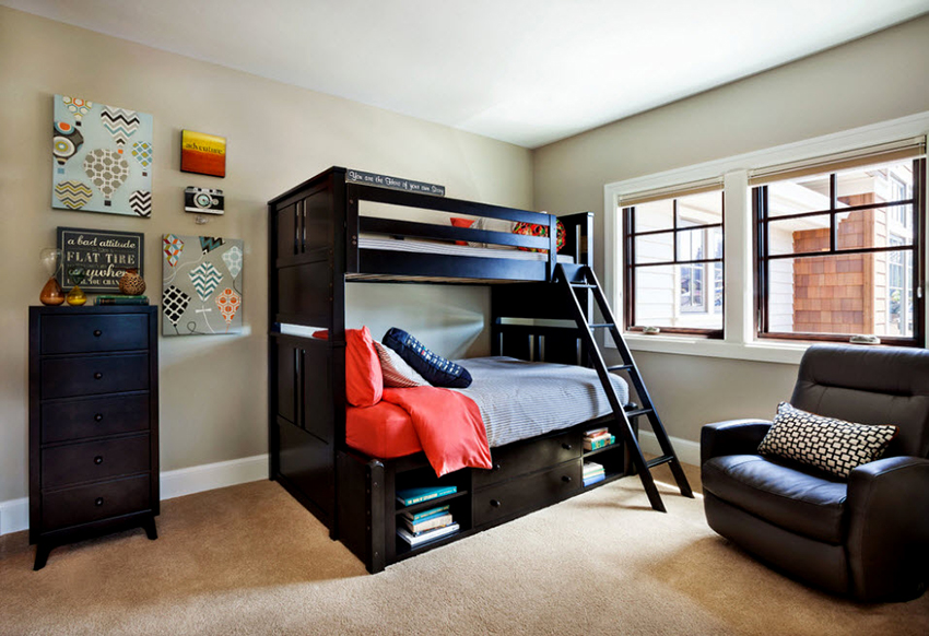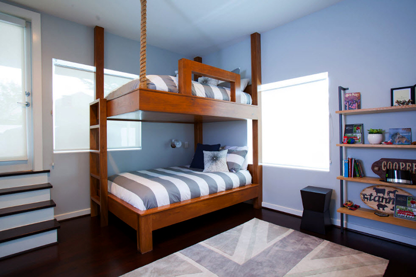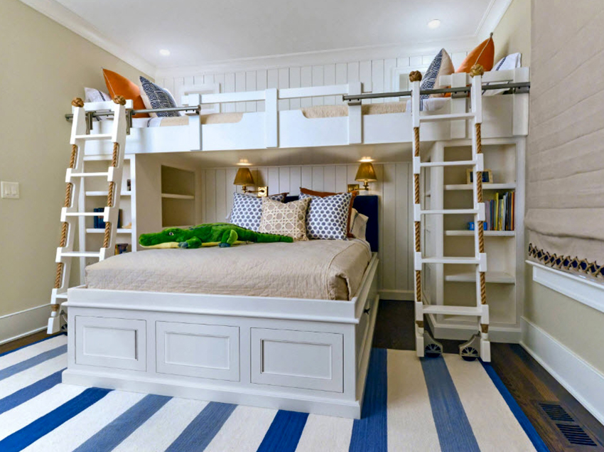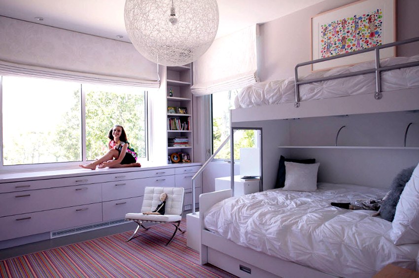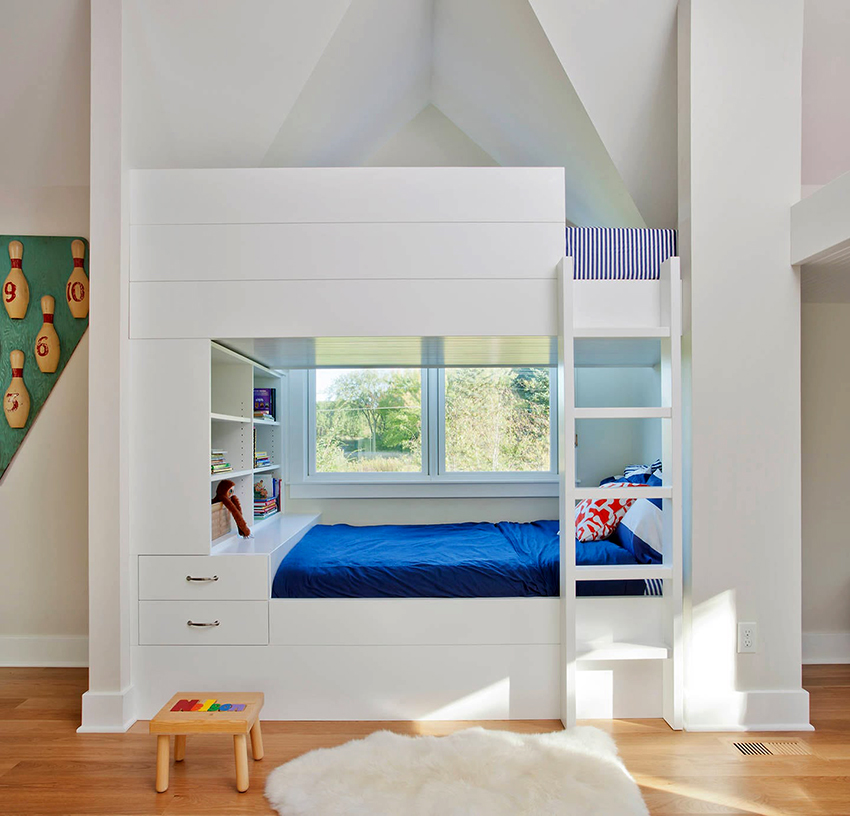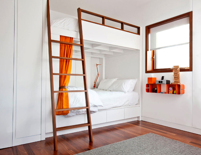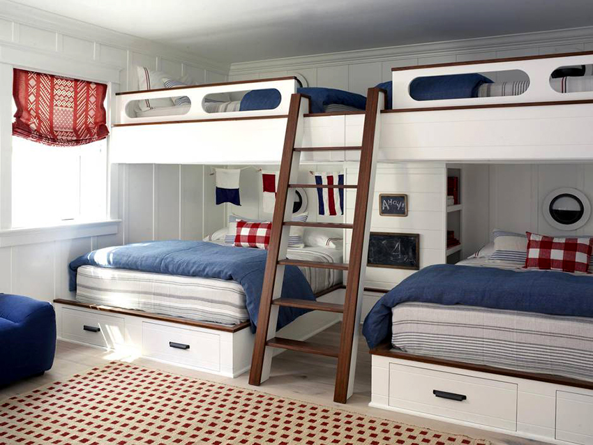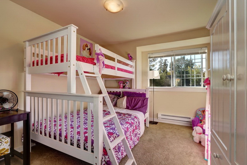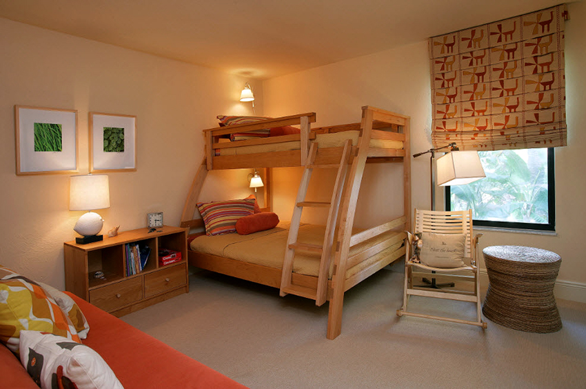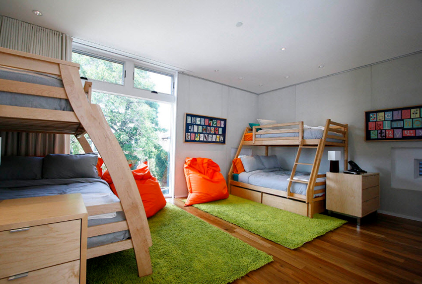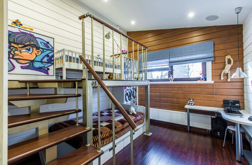 Łóżka piętrowe znajdują zastosowanie nie tylko w małych sypialniach, często są instalowane w dość przestronnych pomieszczeniach.