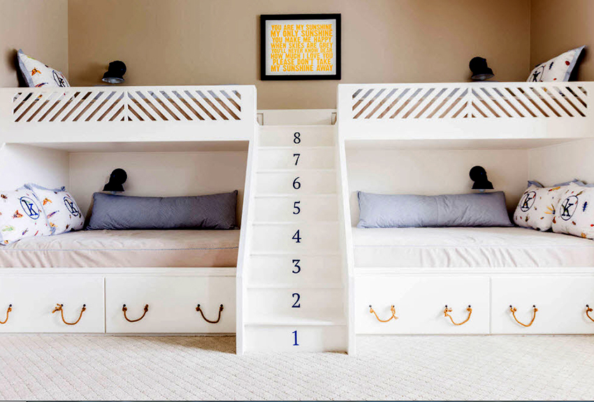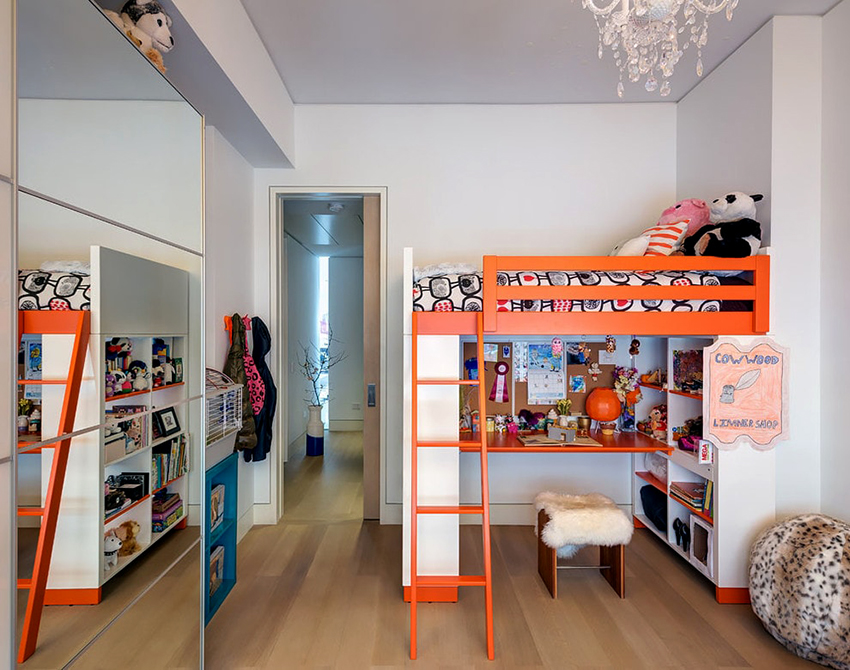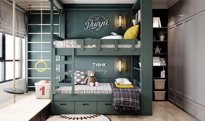 Dzieci powyżej czwartego roku życia mogą spać na najwyższym piętrze z boczną deską. Wskazane jest wyposażenie dolnej przestrzeni pod miejscami do spania indywidualnie dla każdego dziecka, w oparciu o jego osobiste preferencje. Różne opcje są wyraźnie pokazane na zdjęciu dzieci z łóżkiem piętrowym.