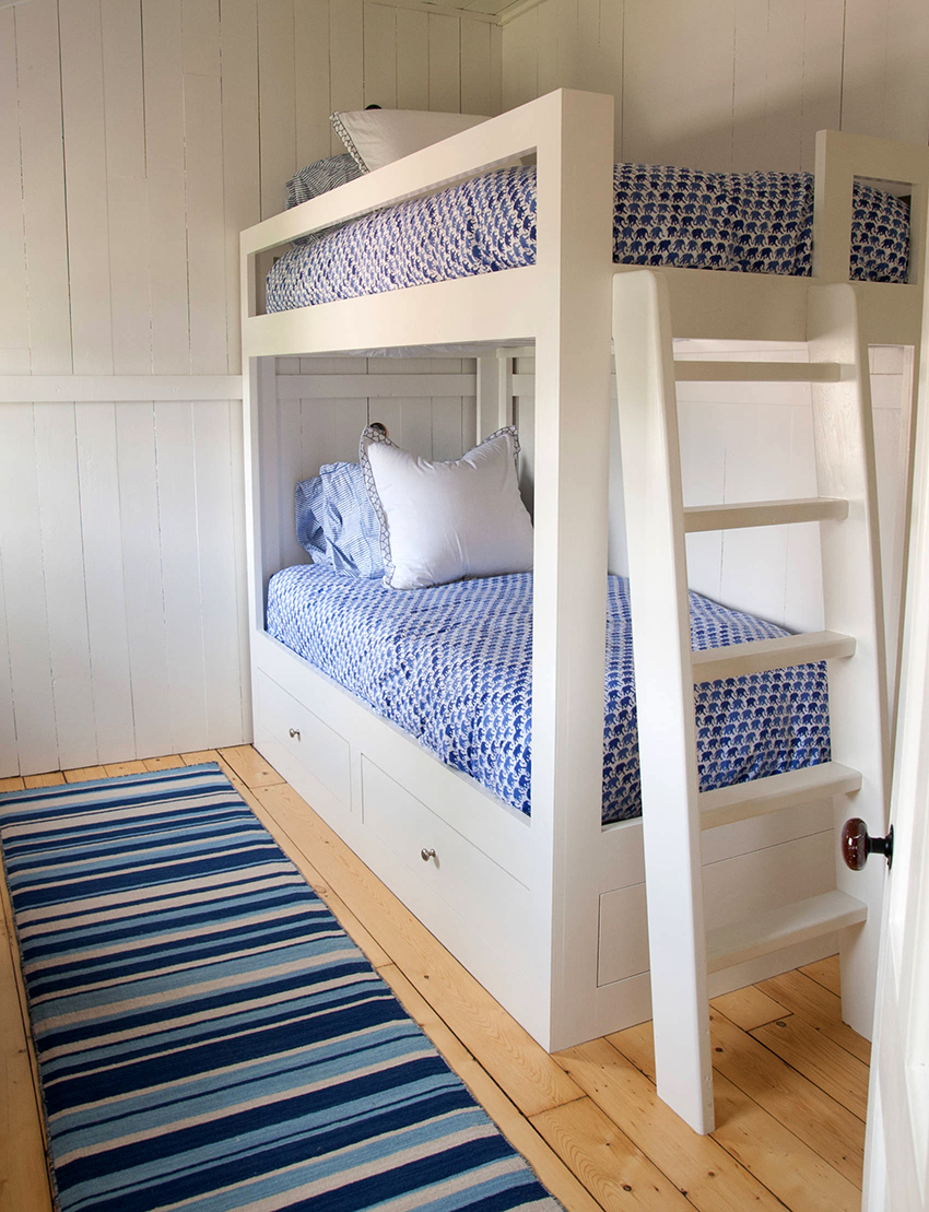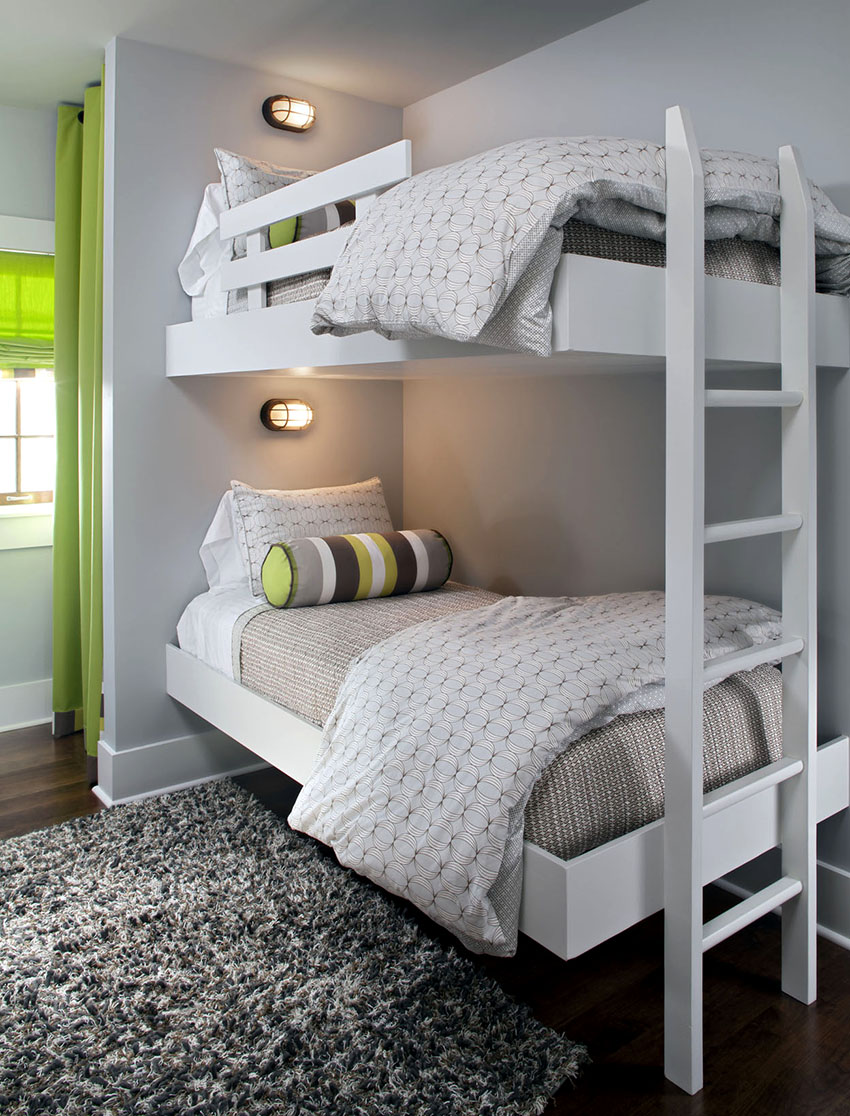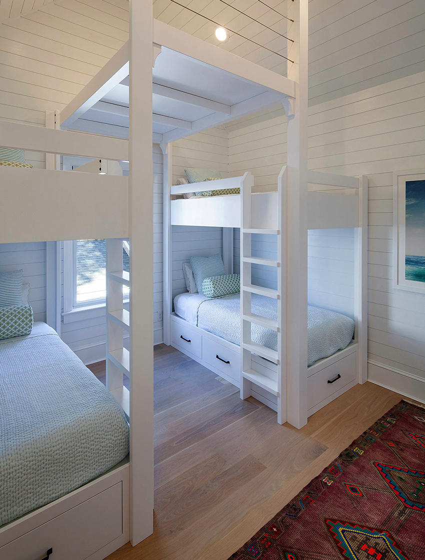 Drugą kategorię reprezentują klasyczne projekty z dwoma oddzielnymi kojami, które można ustawić równolegle, prostopadle lub przesunąć względem siebie, co wyraźnie widać na zdjęciu pokoi dziecięcych z łóżkami piętrowymi.