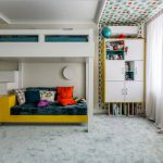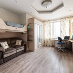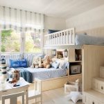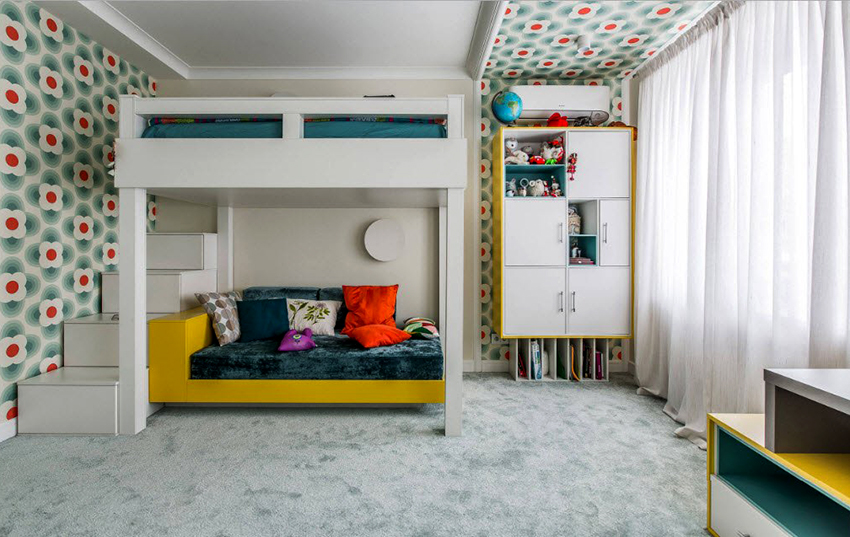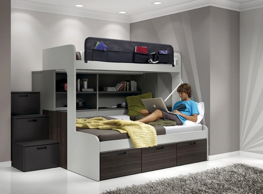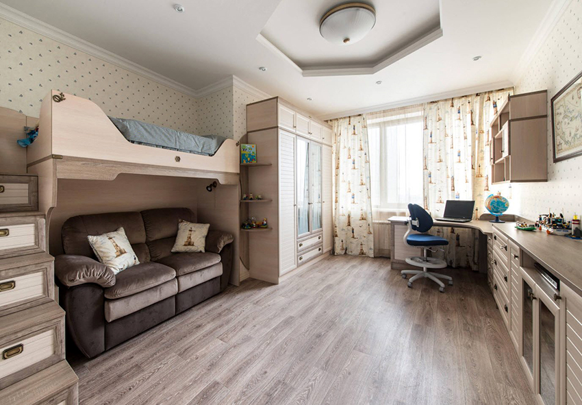 Jeśli przedszkolak i nastolatek mieszkają w tym samym pokoju, zaleca się zakup przejściówki, w której miejsca do spania podzielone są na niezależne elementy. Dobrym rozwiązaniem jest piętrowe łóżko dziecięce z szafą o złożonej konstrukcji, w którym funkcjonalny mebel wyznacza miejsca do spania.