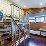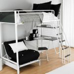 Łóżka piętrowe ze stołem i innymi meblami