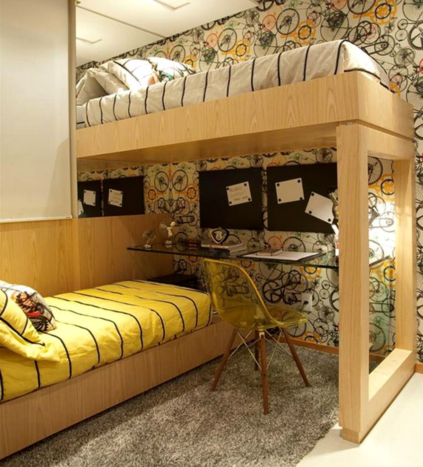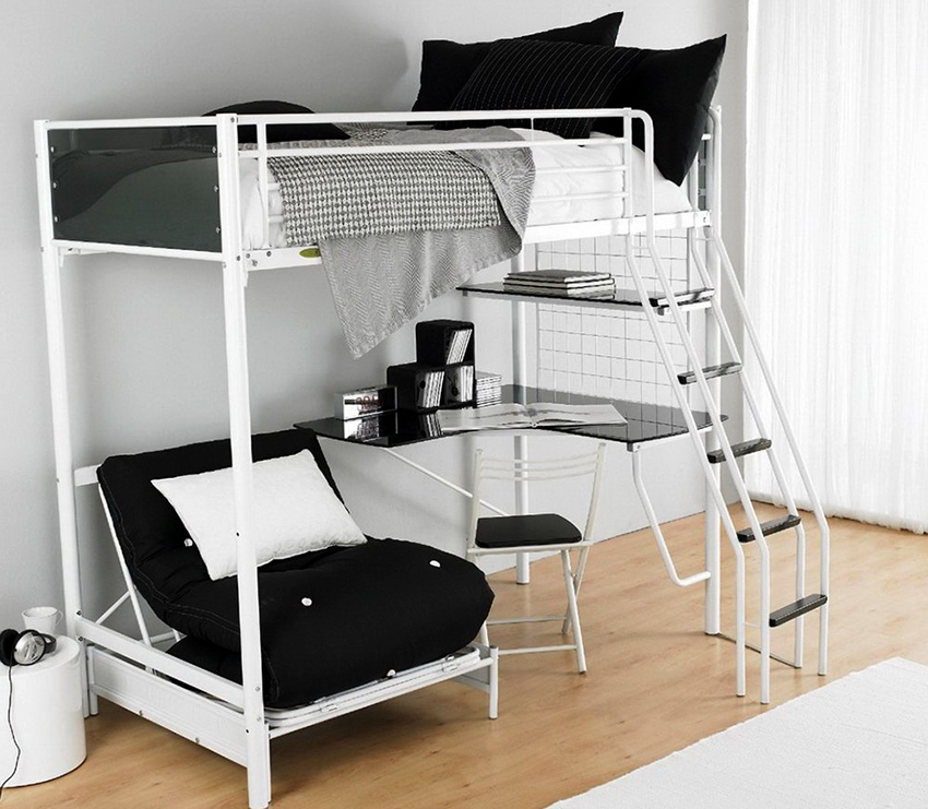 Łóżka piętrowe-transformatory, które zamieniają się w sofy, będą wyglądać ciekawie i niecodziennie. Takie konstrukcje nie wymagają dużo wolnego miejsca i są łatwe w obsłudze.