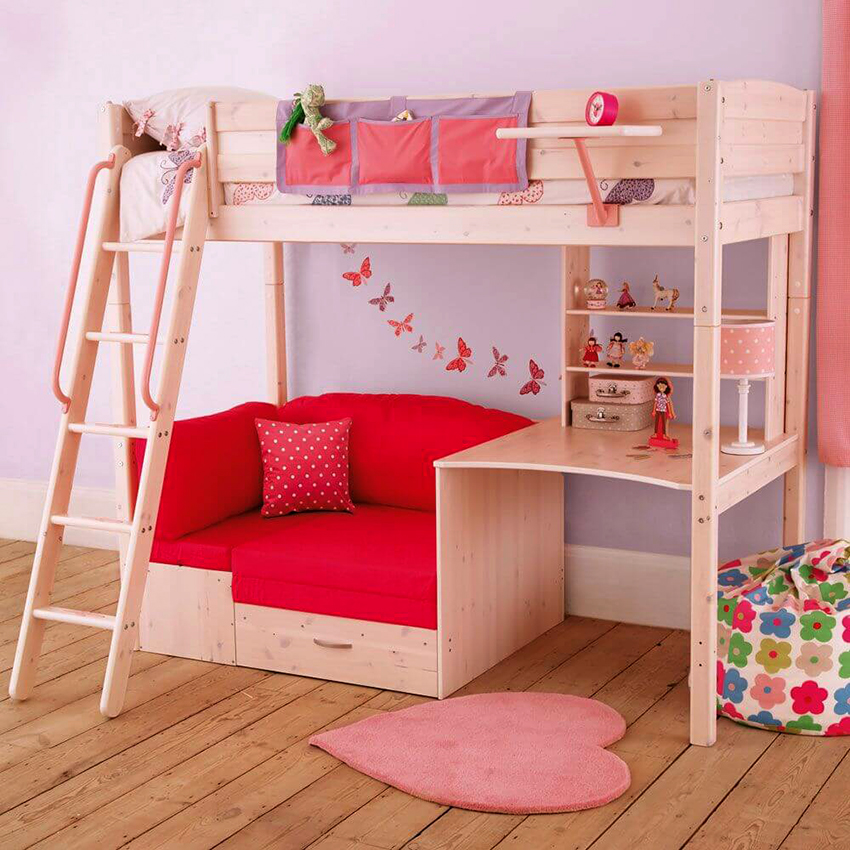 Modele z sofą na niższym poziomie, która zamienia się w szerokie łóżko, wyglądają ciekawie i niecodziennie. Pod nim można umieścić komorę na pranie. Dziecięce łóżko piętrowe z sofą na dole będzie lepsze dla towarzyskich dzieci, które są często odwiedzane przez gości.