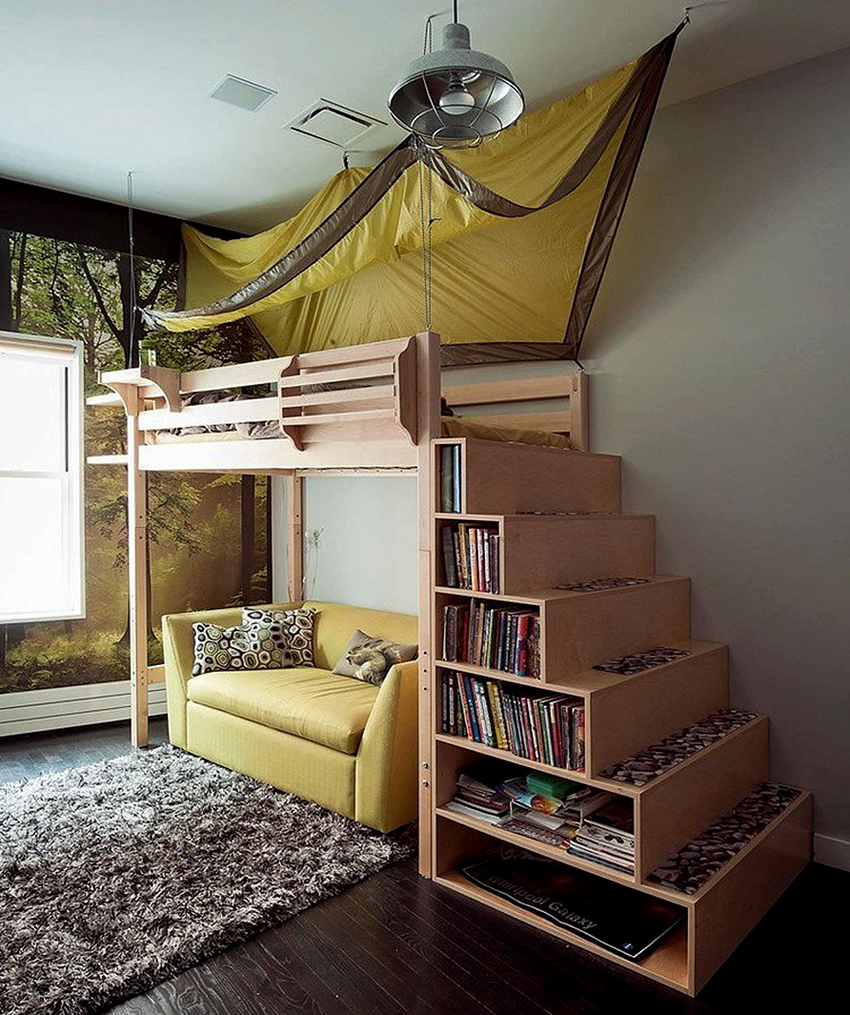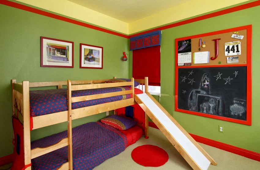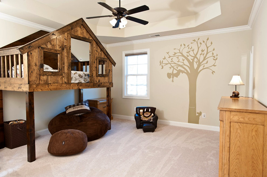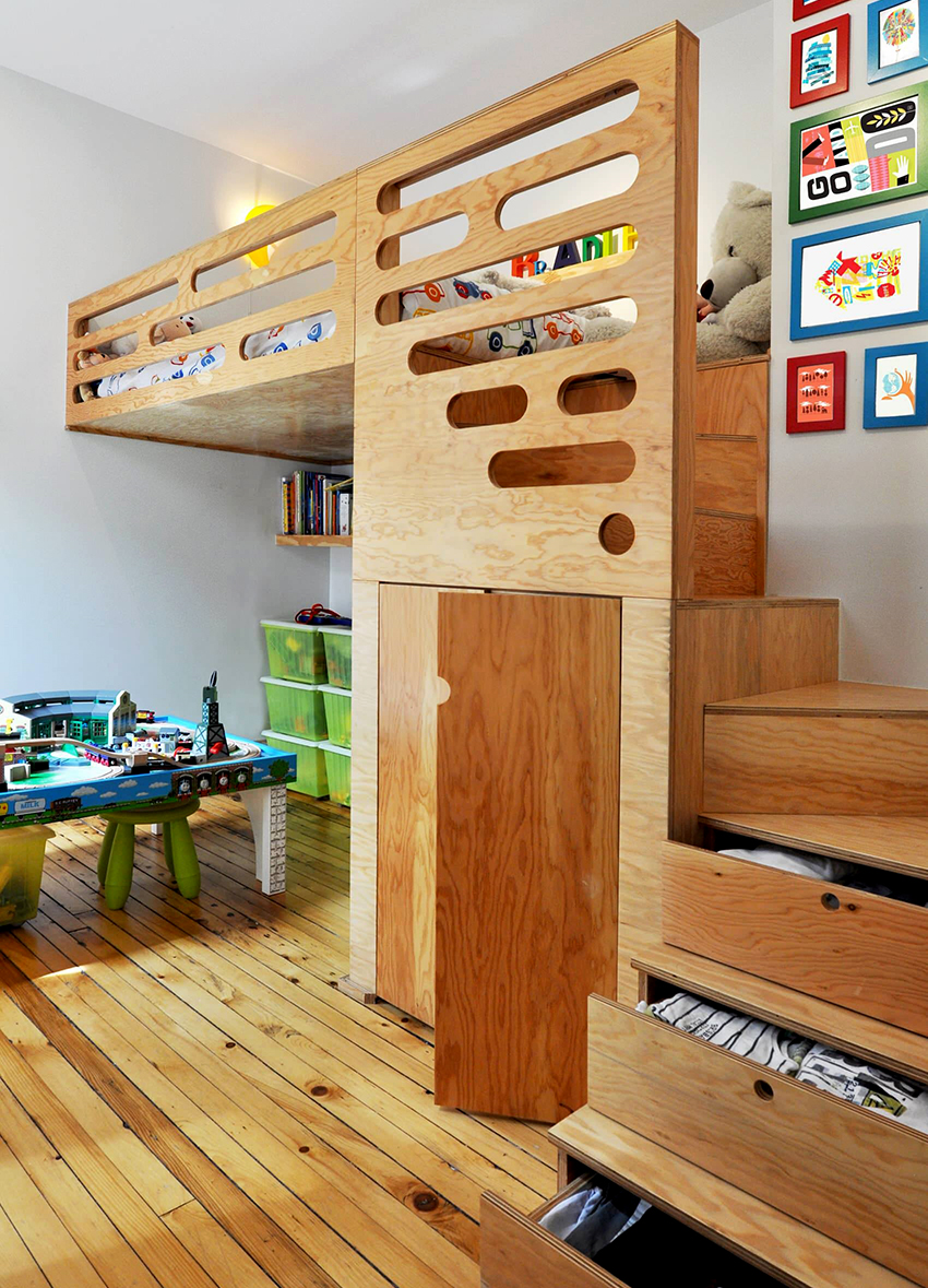 Jeśli rodzina ma jedno dziecko, a pokój jest mały, często wyposażają miejsce do spania na drugim piętrze, przeznaczając dolną przestrzeń na plac zabaw