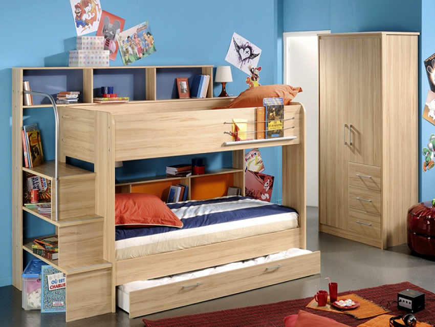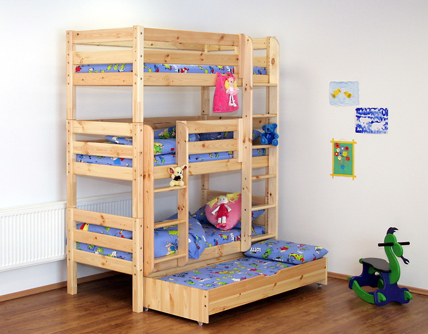 Trzecia kategoria obejmuje łóżka piętrowe dla dzieci z trzema kojami. Standardowy model tego projektu ma postać nierozłącznej ramy w kształcie litery L z dwoma łóżkami u góry. Dolna koja sąsiaduje z miejscem do zabawy lub pracy. Ten projekt wymaga dużo miejsca. W przypadku małych pomieszczeń najbardziej racjonalnym rozwiązaniem jest łóżko z trzema wysuwanymi poziomami.