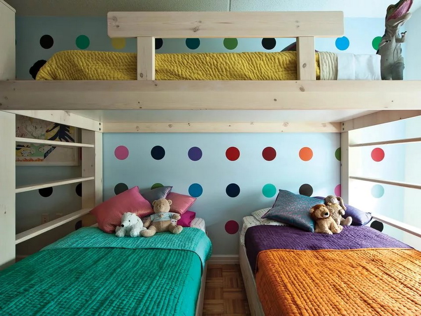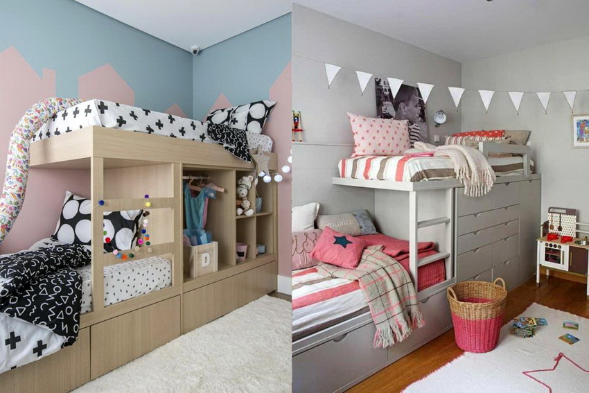 W przypadku dzieci tej samej płci możesz użyć prawie każdej opcji łóżka. Dla dzieci różnej płci odpowiedni jest klasyczny design, a także rozkładane łóżko transformacyjne na helowych kołach, którego dolny poziom przesuwa się w dowolne dogodne miejsce. Uniwersalnym rozwiązaniem jest łóżeczko dziecięce.