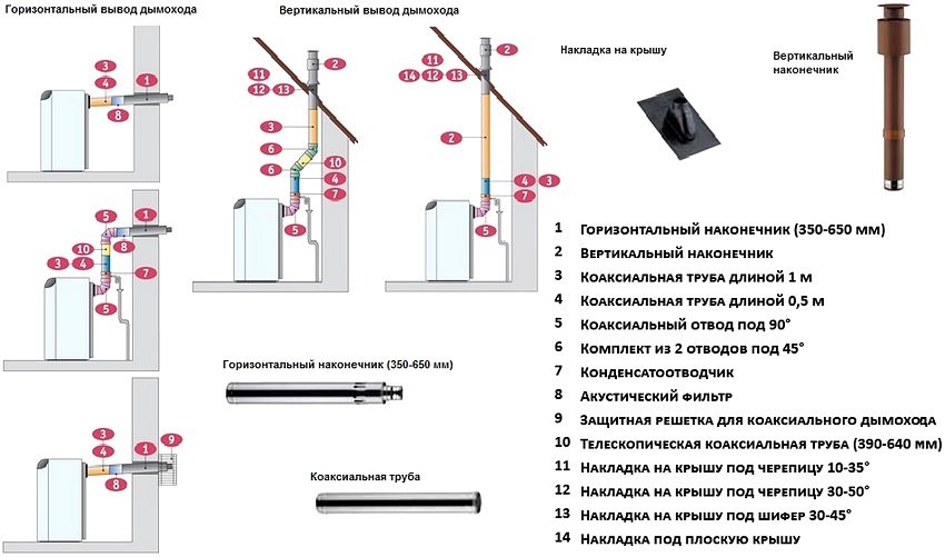 Wielu producentów urządzeń gazowych zawiera w dostawie rurę do usuwania produktów spalania. Jeśli kupiłeś współosiowy komin do kotła gazowego wraz z wyposażeniem, to należy sprawdzić, czy w zestawie znajduje się pozioma część rury (zwykle około 1 m długości), odgałęzienie, końcówka (głowica), komplet uszczelek, membrana. Jeśli podczas instalowania rury przez ścianę konieczne jest ominięcie wszelkich występów lub kształtek, stosuje się łuki i łuki.