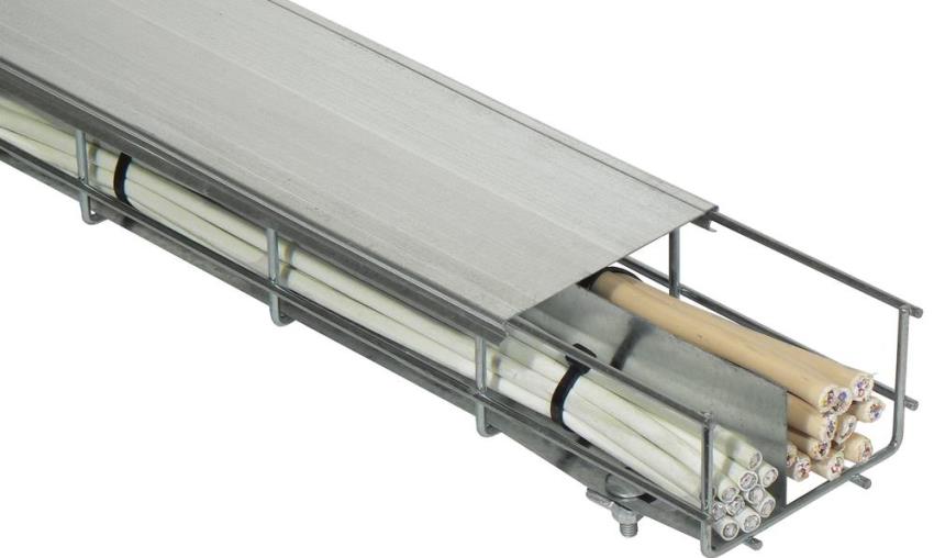 As bandejas de arame são usadas na disposição de tetos suspensos ou suspensos. Eles podem reduzir significativamente o tempo de colocação do cabo no canal de cabo, enquanto a estimativa também é reduzida, já que não é necessária a compra de pequenos fixadores, você pode se limitar a apenas algumas suspensões. A altura das estruturas é de 80, 50 e 100 mm. A largura pode ser variada e varia de 50 mm a 600 mm. Comprimento padrão - 3 m.