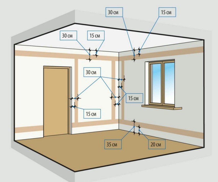 Para arranjar um recesso para uma saída, você precisará de uma broca e um bico especial - uma coroa. As pré-marcações são aplicadas na parede. A distância mínima do teto é de 15 cm. Equipamentos a gás não devem ser colocados perto dos fios. A distância mínima permitida é de 50 cm.