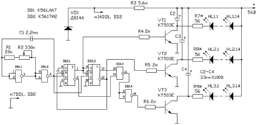 Fazer uma guirlanda multicolorida não é tão difícil. Depois de revisar o diagrama, você verá que o princípio de seu funcionamento é bastante simples devido ao fato de que cada cor está conectada a um gerador separado. Portanto, compreender a estrutura geral do sistema para uma cor permitirá que você use vários canais idênticos ao mesmo tempo, permitindo que a guirlanda brilhe em muitas cores diferentes.