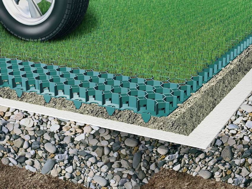 Conselho útil! Recomenda-se a instalação de geogrelhas de concreto em solos sólidos onde é difícil conseguir a drenagem total da água após a precipitação.