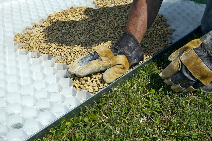 Quando esticado, este produto cria uma estrutura de reforço estável e durável, cujas células podem ser preenchidas com areia, cascalho, terra ou outro material que é fixo e limitado em movimento. Usando argamassa de concreto como enchimento, você pode criar uma plataforma monolítica. Se você despejar lascas de mármore no favo de mel, o resultado será um caminho decorativo.