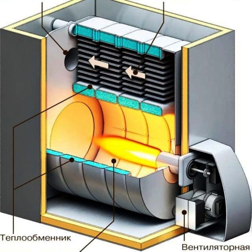 Dacă cazanul este corect reglat, uleiul uzat este ars complet, astfel încât să nu se formeze produse toxice de ardere. Dispozitivul constă din numărul minim de piese, care poate fi văzut pe diagramele cazanului. Acest lucru crește fiabilitatea și durabilitatea structurii. Nu este nevoie de mult timp pentru a încălzi cazanul. Convecția forțată face ca temperatura camerei să crească rapid.