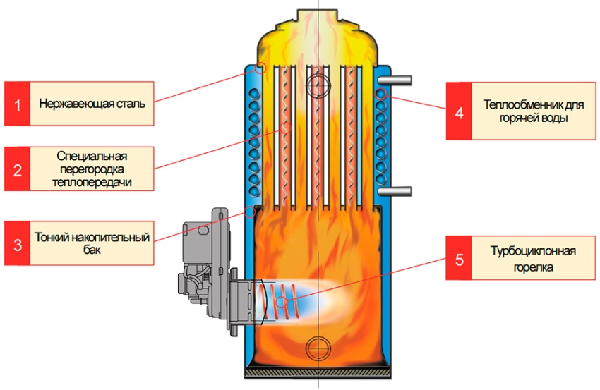 Un cap special se află în arzătorul ventilatorului, care formează și ține flacăra, normalizând procesul de ardere a combustibilului. Dispozitivele au capacitatea de a încălzi combustibilul înainte de a intra în duză. Cazanele sunt echipate cu un cuptor reversibil cu două treceri.