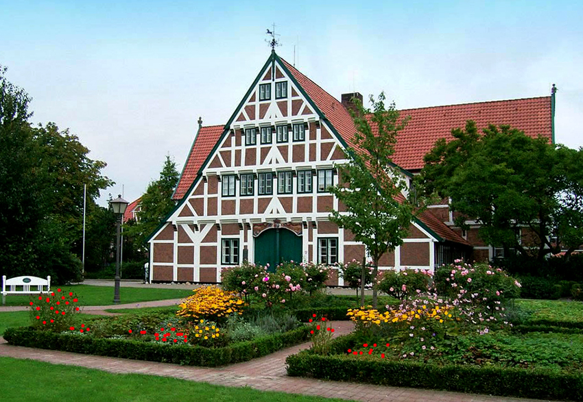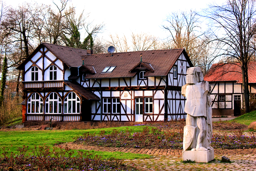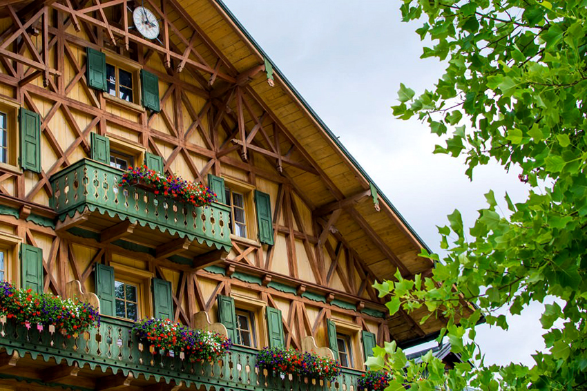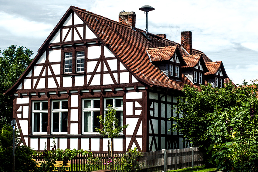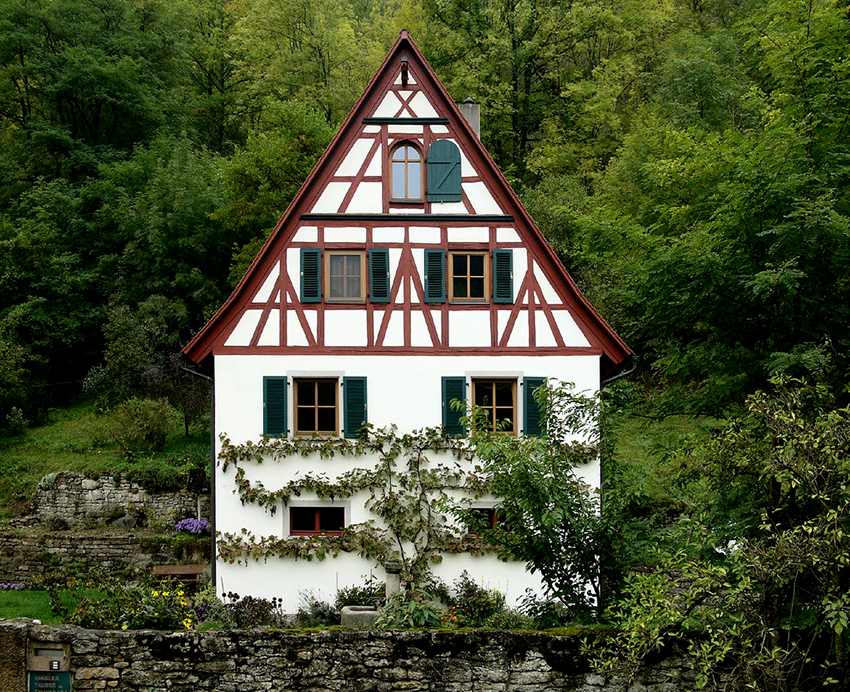 - Utilizarea culorilor contrastante. În fotografia caselor germane, clădirile cu jumătate de lemn se disting în mod necesar printr-un acoperiș din dale roșii și o ușă masivă, care este pictată într-o culoare contrastantă (față de fațadă).