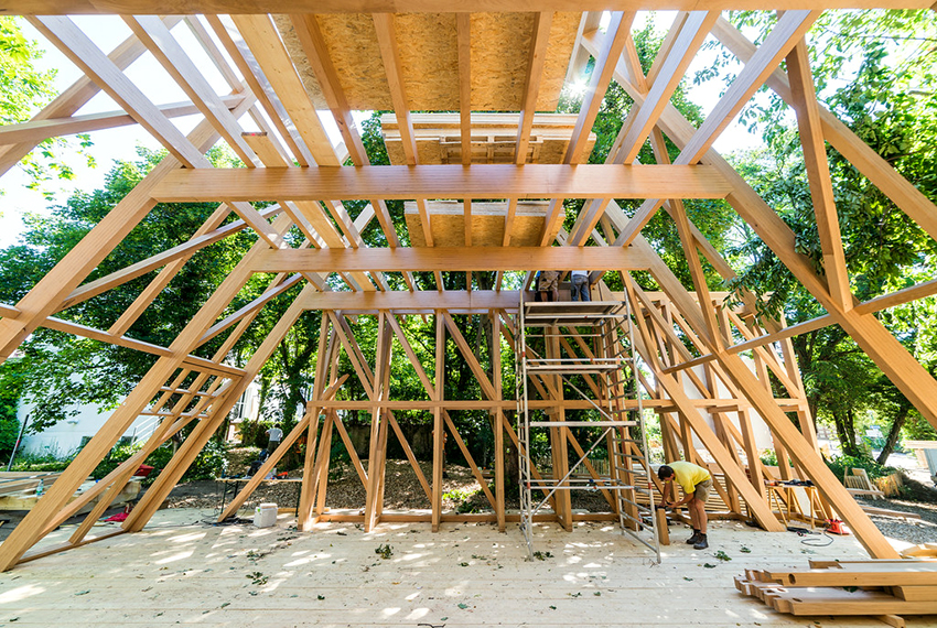 Se recomandă ca acoperișul și alte elemente de susținere să fie realizate din lemn de furnir laminat, iar coniferele devin materialul la alegere. Grinzile orizontale și stâlpii sunt cadrul peretelui. Bretele diagonale formează rigiditatea cadrelor și servesc drept protecție suplimentară în caz de cutremur. Pentru legarea inferioară a casei, se folosește adesea o bară, care este atașată la fundație cu șuruburi de ancorare. Baza casei (conform tehnologiei germane fachwerk) este acoperită separat cu un strat de impermeabilizare; în acest scop, se folosesc foi de polistiren expandat.