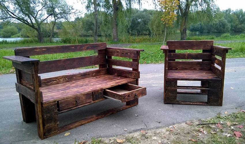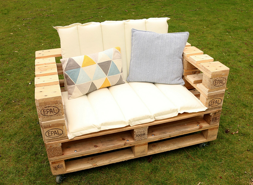 Z paliet je tiež ľahké vyrobiť peknú a pohodlnú drevenú pohovku. Bude to vyžadovať dve palety, klince, pílku, vŕtačku, niekoľko fošní a brúsny papier. Najlepšie je, keď sú palety pre sedadlo a operadlo rovnako veľké.