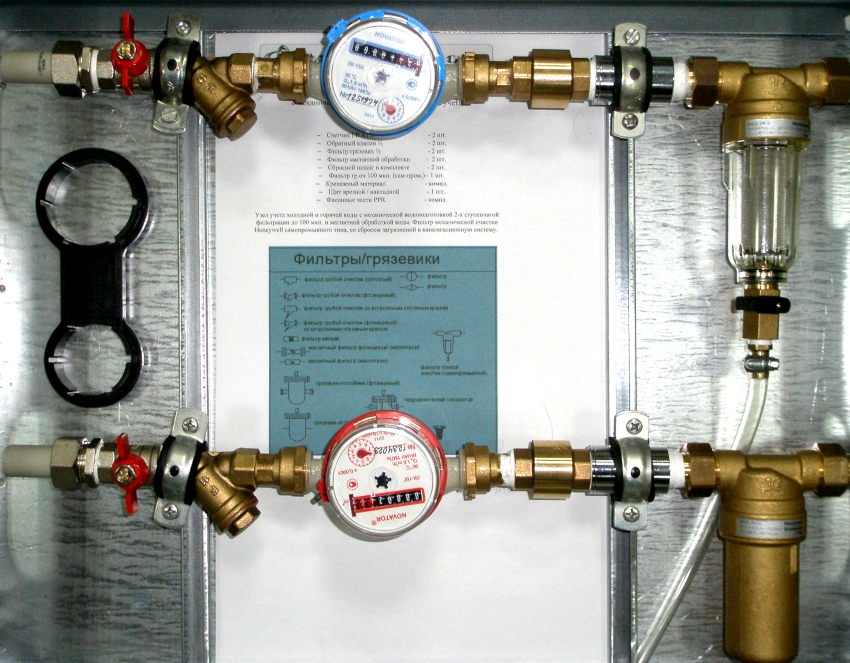 Prvým krokom je inštalácia uzamykacieho zariadenia (klepnutie). Ďalej je nainštalovaný filtračný prvok. Prvky sú navzájom dokované pomocou špeciálnej spojky vybavenej prevlečnou maticou. Potom to bude samotné zariadenie na meranie vody. Montáž zostavy končí inštaláciou druhej spojky. V niektorých prípadoch je v dizajne uvedený spätný ventil.