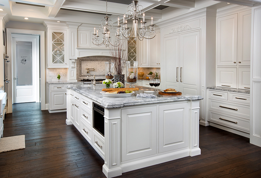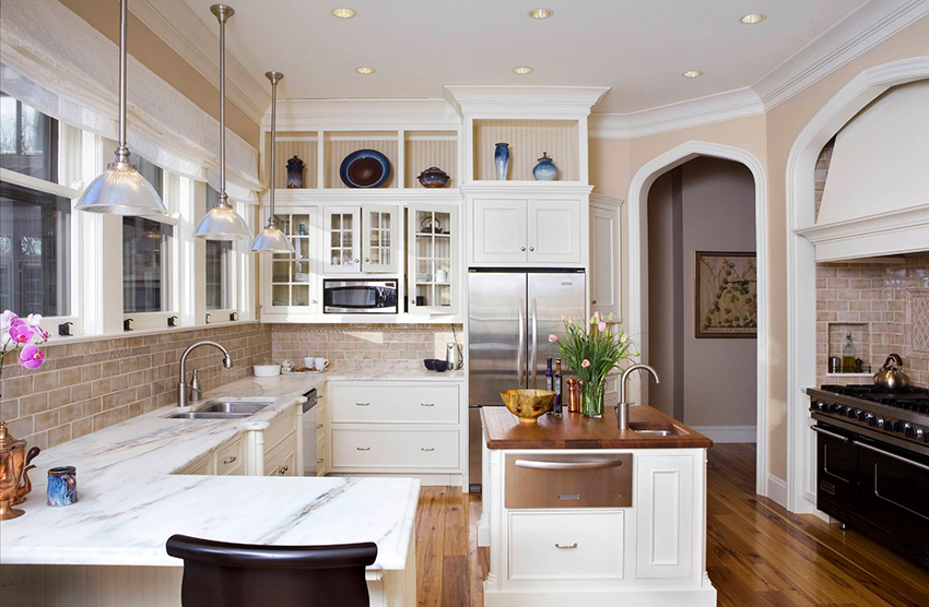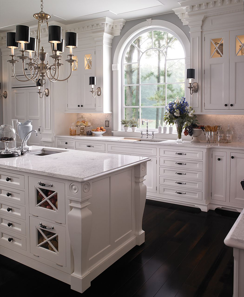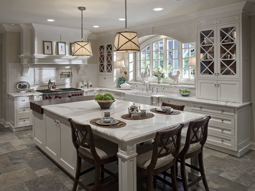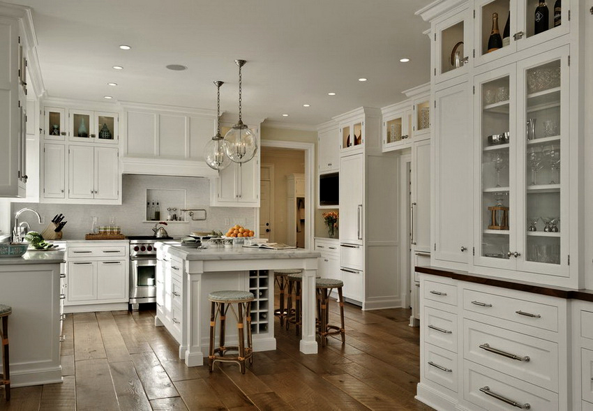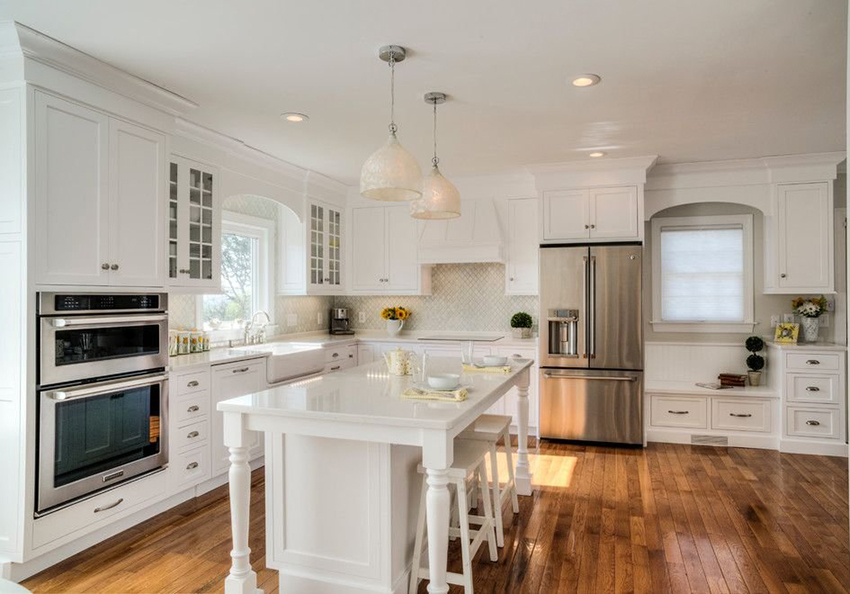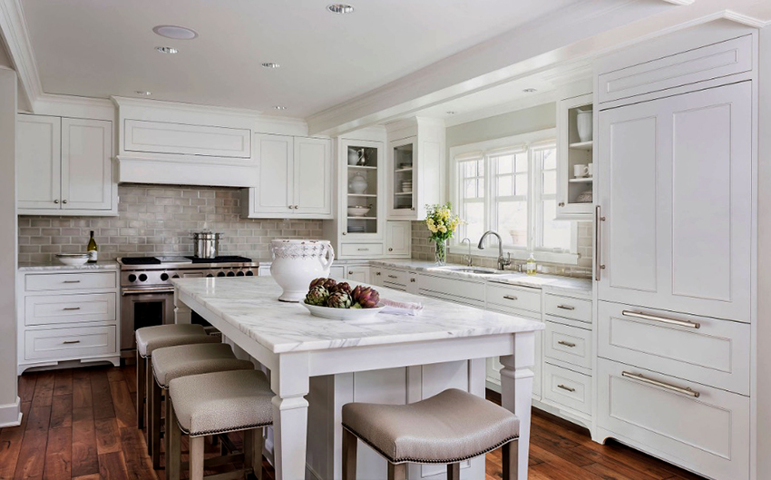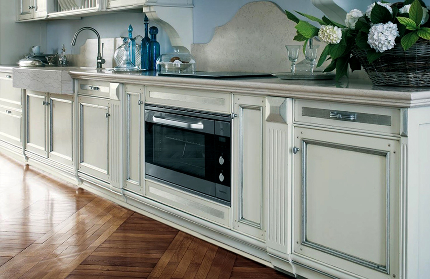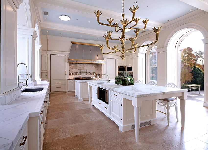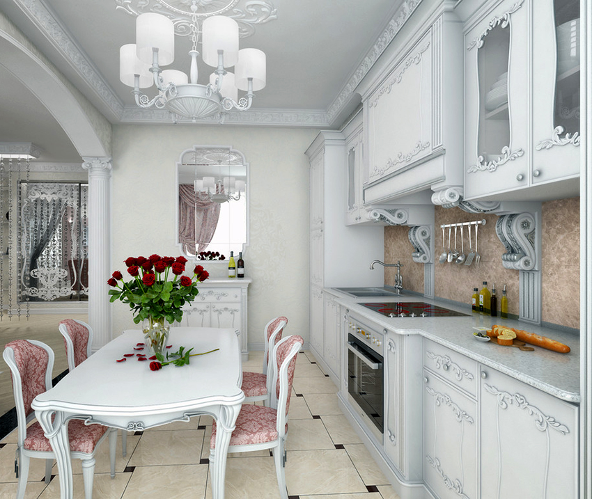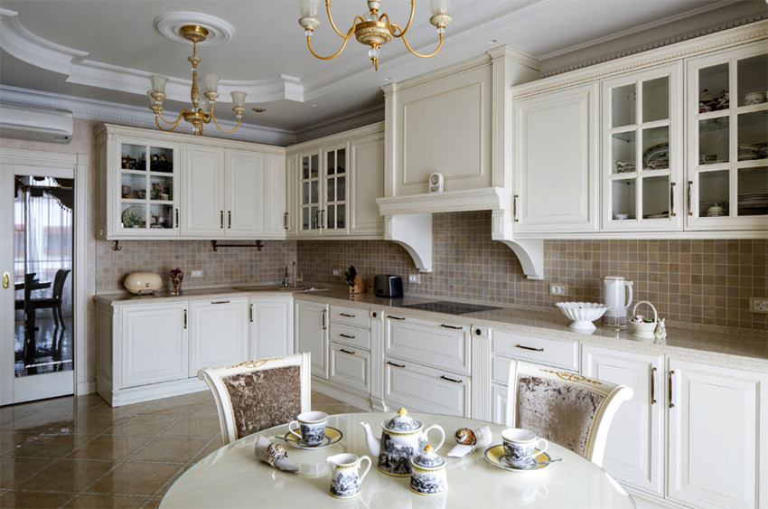 ในห้องครัวสีขาวคลาสสิกความมีชีวิตชีวาของสีขาวถูกหักล้างด้วยความอวดรู้และความเป็นรูปเป็นร่างของเฟอร์นิเจอร์และรายละเอียดการตกแต่งรวมทั้งบนผนังที่ใช้งานได้อาจเป็นกระเบื้องลายนูนที่มีขอบสีทองหรือรูปปั้นนูนตามแนวเส้น ในรูปแบบประวัติศาสตร์ควรใช้หินธรรมชาติหรือเทียมที่มีโทนสีเทาหรือสีเบจซึ่งสอดคล้องกับสีของหินอ่อน
