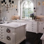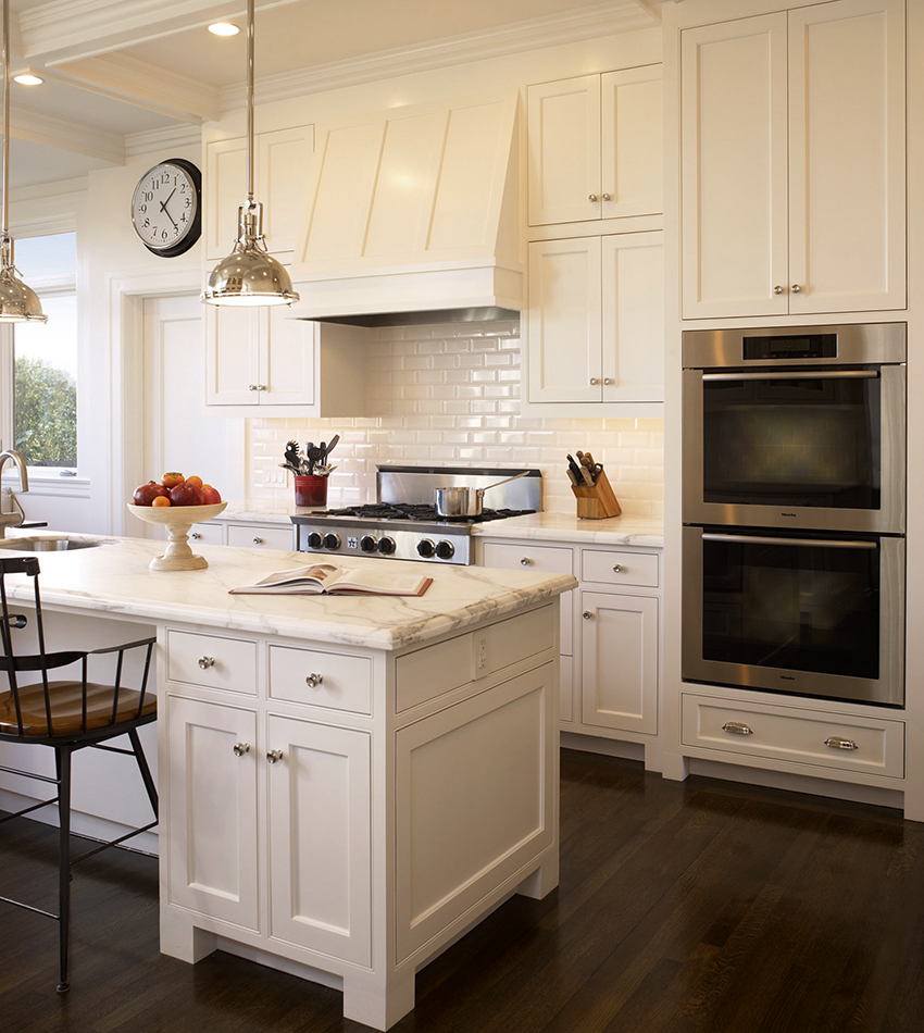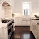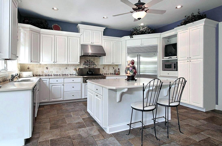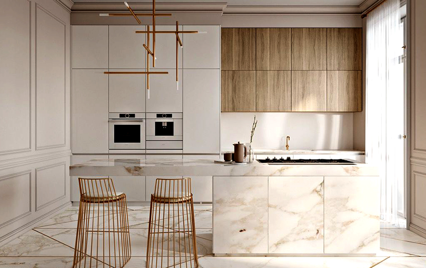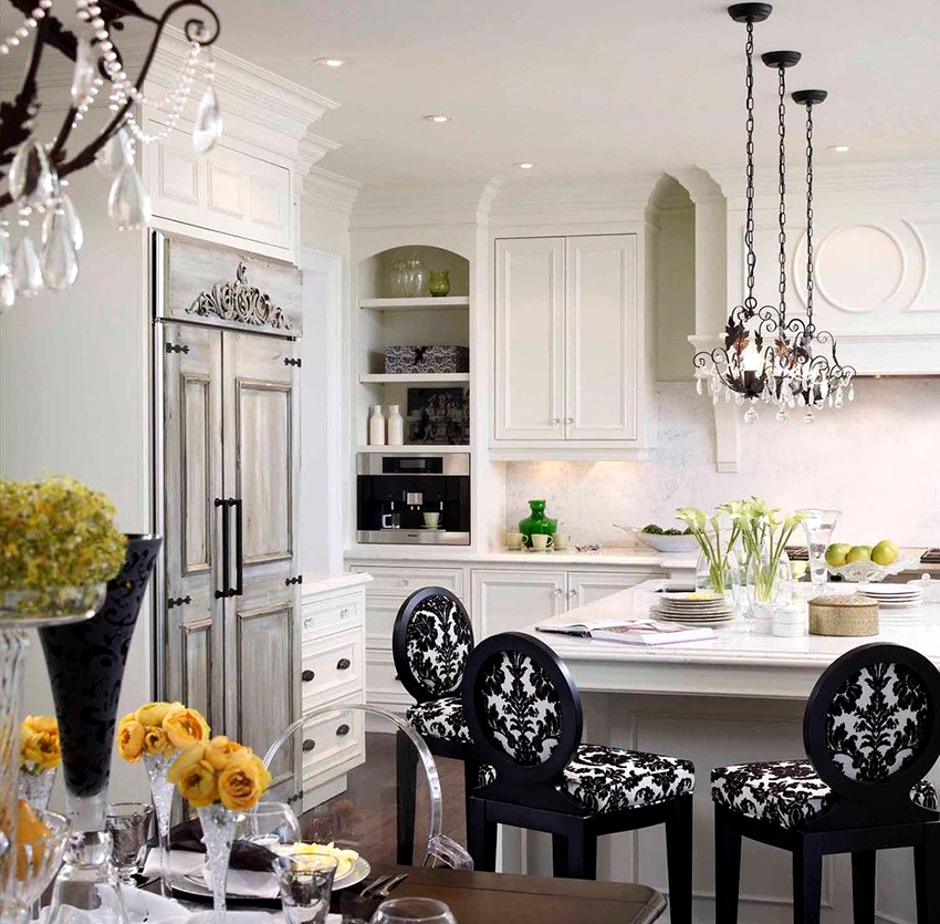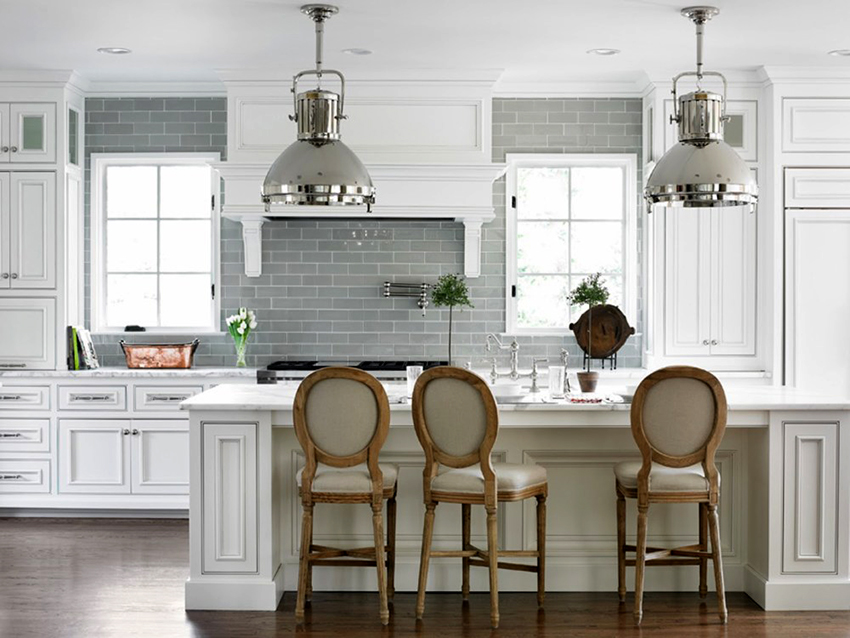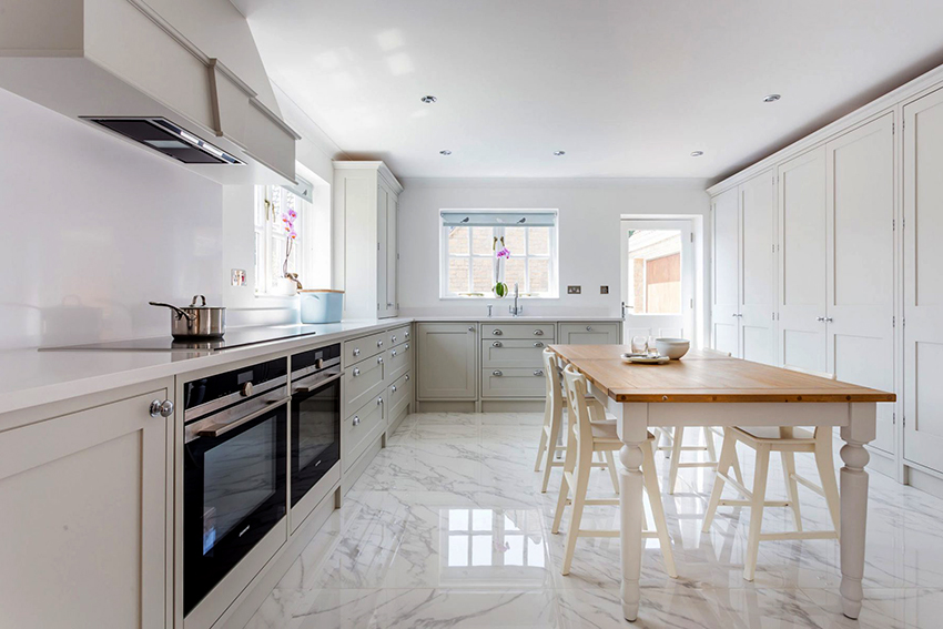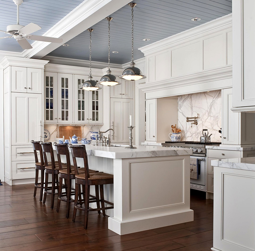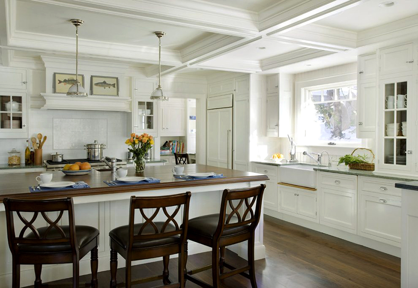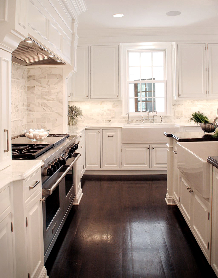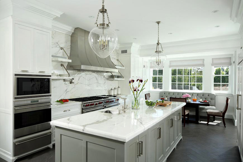 ในห้องครัวสีขาวคลาสสิกความมีชีวิตชีวาของสีขาวถูกหักล้างด้วยความอวดรู้และความเป็นรูปเป็นร่างของเฟอร์นิเจอร์และรายละเอียดการตกแต่งรวมทั้งบนผนังที่ใช้งานได้อาจเป็นกระเบื้องลายนูนที่มีขอบสีทองหรือรูปปั้นนูนตามแนวเส้น ในรูปแบบประวัติศาสตร์ควรใช้หินธรรมชาติหรือเทียมที่มีโทนสีเทาหรือสีเบจซึ่งสอดคล้องกับสีของหินอ่อน