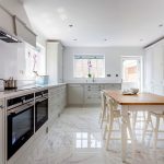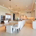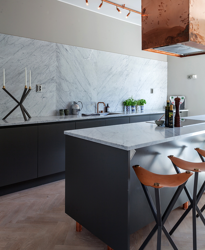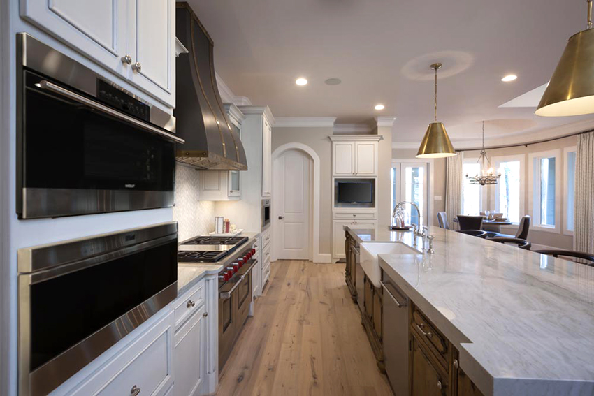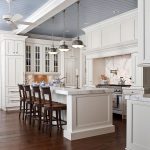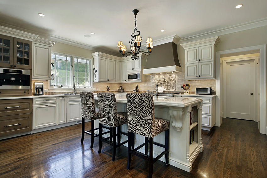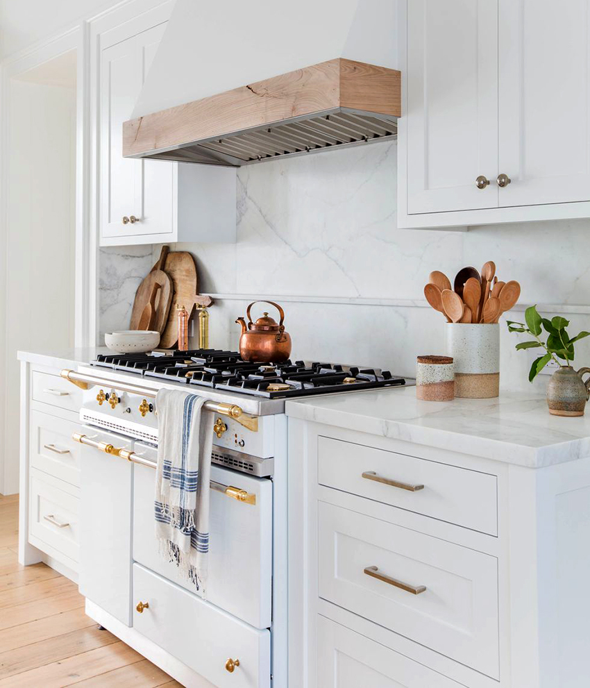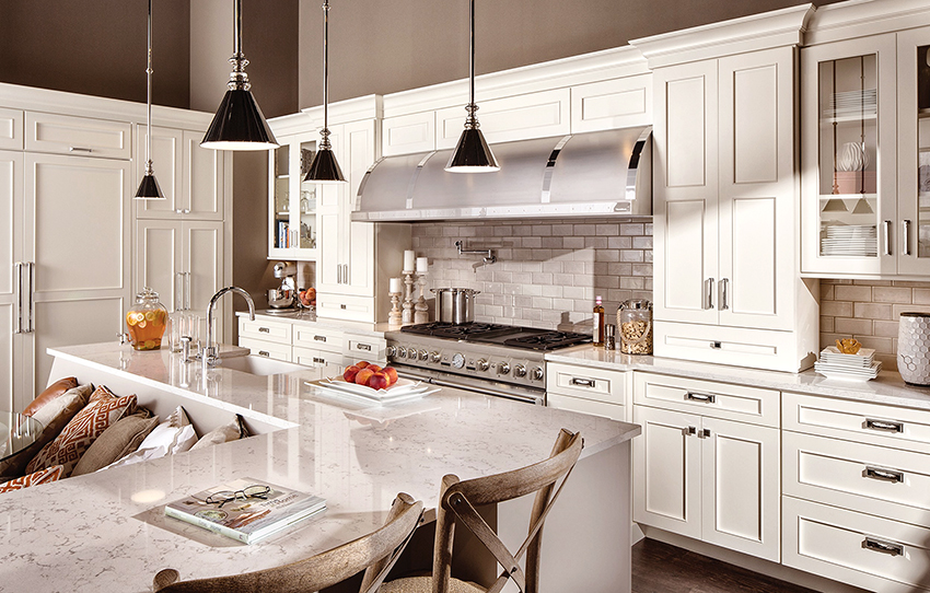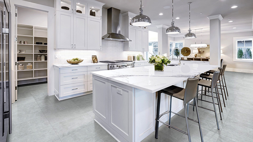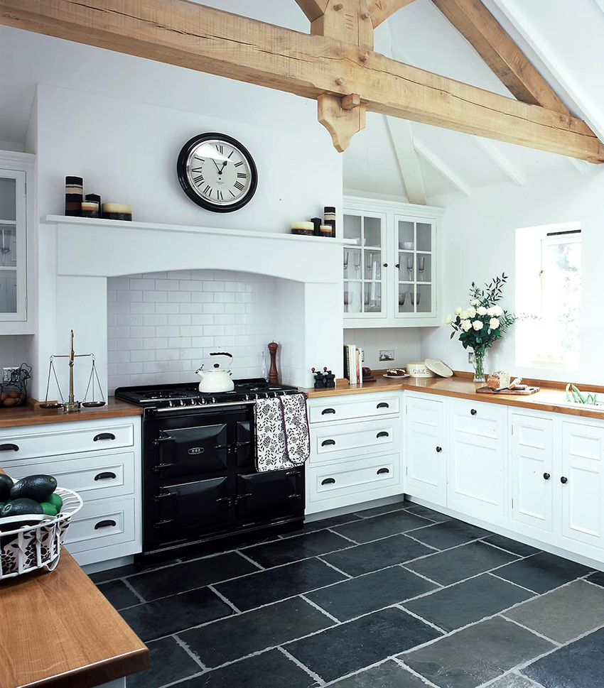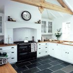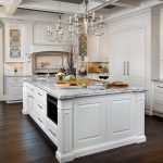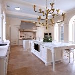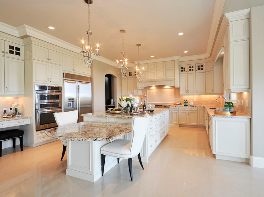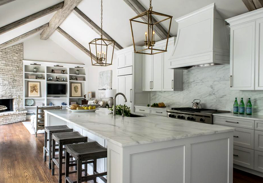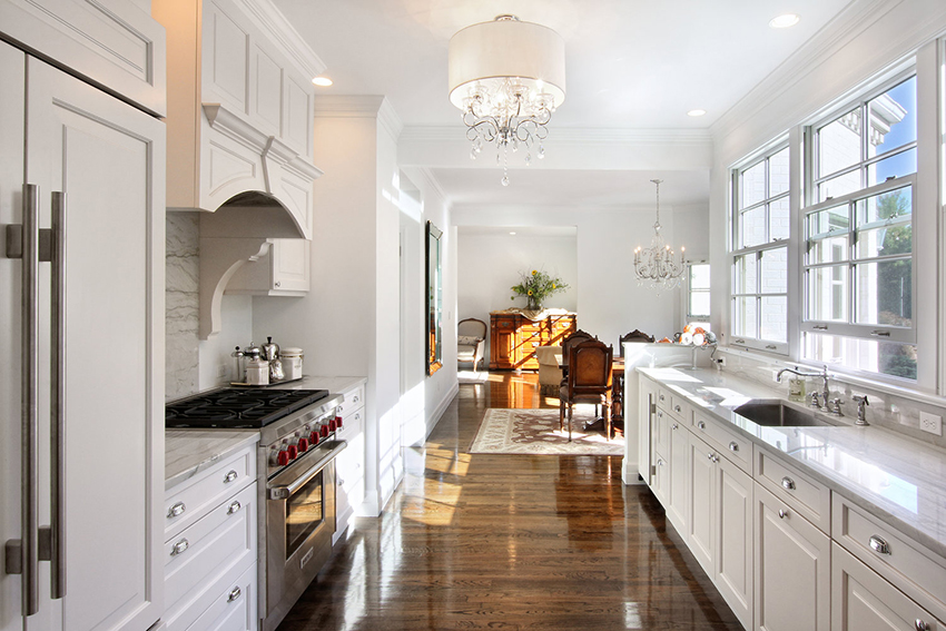ในห้องครัวสีขาวคลาสสิกความมีชีวิตชีวาของสีขาวถูกหักล้างด้วยความอวดรู้และความเป็นรูปเป็นร่างของเฟอร์นิเจอร์และรายละเอียดการตกแต่งรวมทั้งบนผนังที่ใช้งานได้อาจเป็นกระเบื้องลายนูนที่มีขอบสีทองหรือรูปปั้นนูนตามแนวเส้น ในรูปแบบประวัติศาสตร์ควรใช้หินธรรมชาติหรือเทียมที่มีโทนสีเทาหรือสีเบจซึ่งสอดคล้องกับสีของหินอ่อน