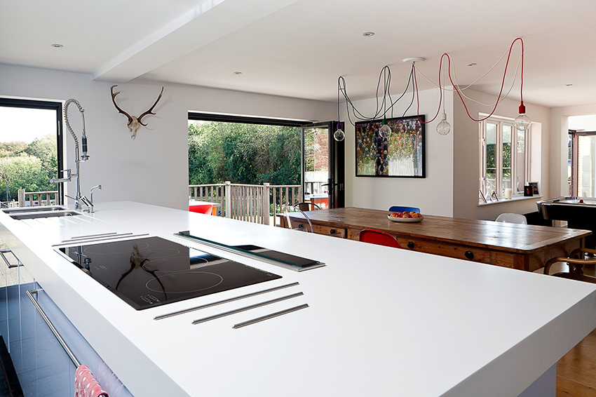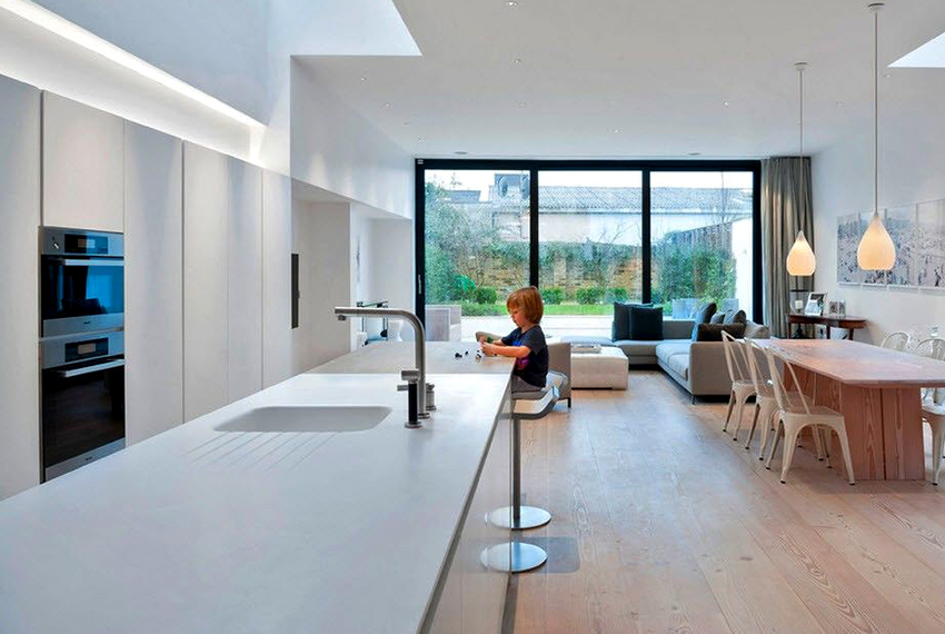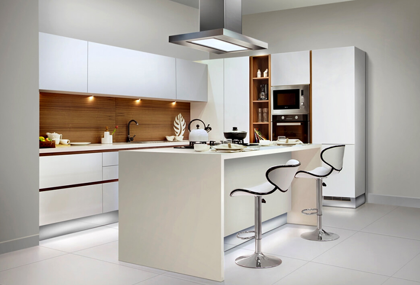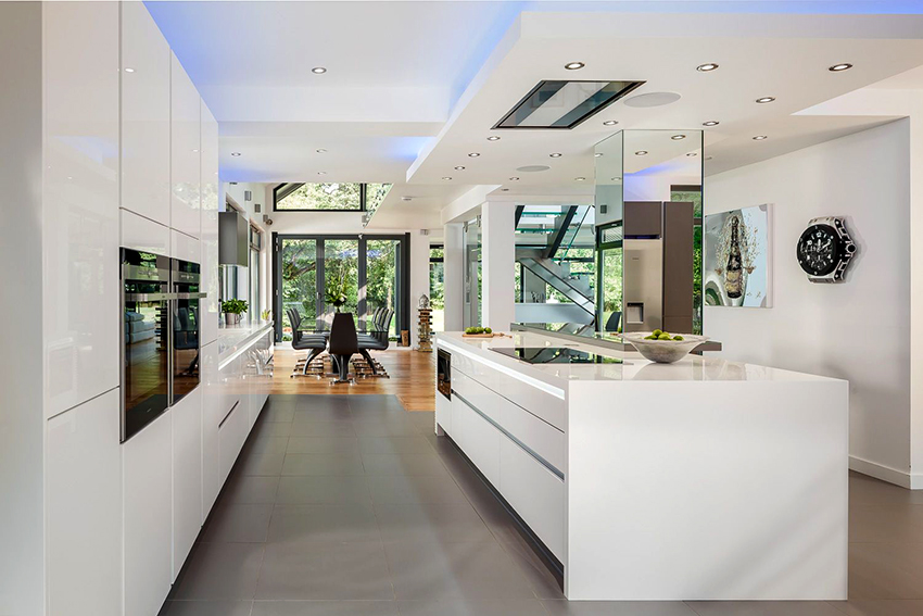 สีขาวเนื่องจากความอเนกประสงค์จะเข้ากับสไตล์ที่หลากหลายทั้งคลาสสิกและสมัยใหม่ สามารถใช้ได้ไม่เพียง แต่ในห้องแยกต่างหาก แต่ยังใช้ในห้องแบบเปิดโล่ง นี่เป็นหลักฐานจากภาพถ่ายจำนวนมากของห้องครัวสีขาวที่มีเคาน์เตอร์สีขาวอยู่ด้านใน ในเวลาเดียวกันแต่ละสไตล์มีความแตกต่างเฉพาะของตัวเอง มีความเกี่ยวข้องโดยเฉพาะอย่างยิ่งในรูปแบบสมัยใหม่:
