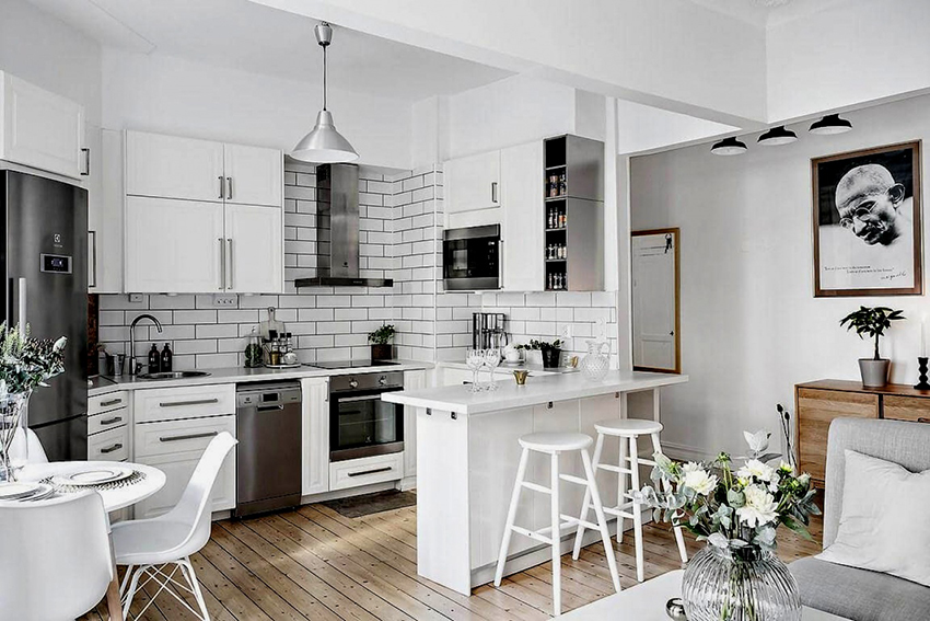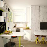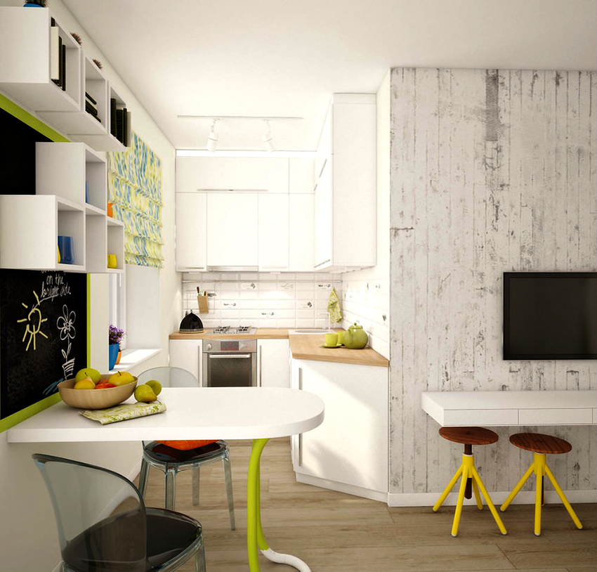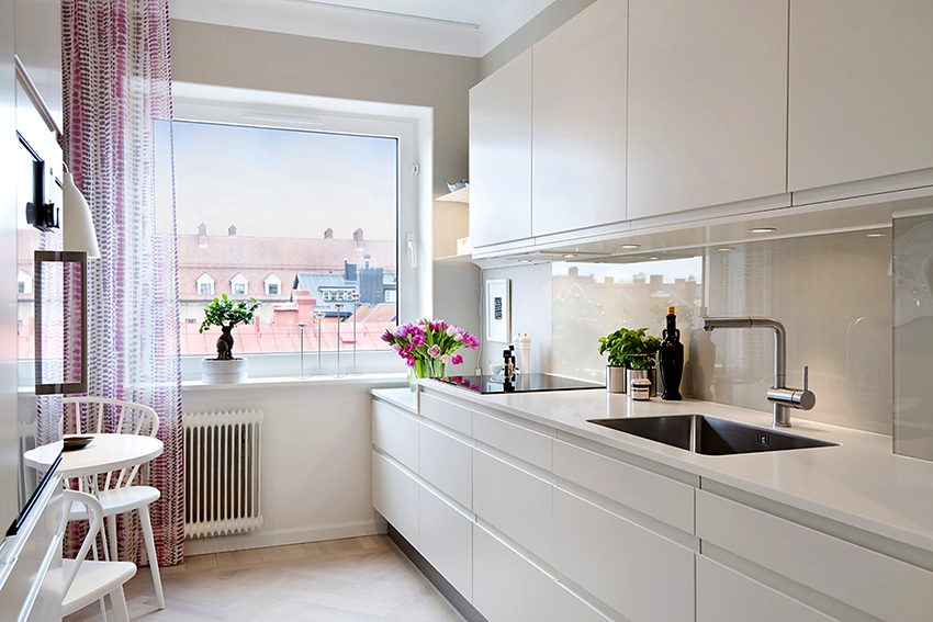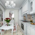 ความเด่นของสีขาวในการตกแต่งภายในก่อให้เกิดความรู้สึกของพื้นที่เพิ่มเติม นั่นคือเหตุผลที่นักออกแบบแนะนำให้ติดตั้งห้องครัวสีขาวไว้ภายในห้องครัวขนาดเล็ก ในทางตรงกันข้ามเฟอร์นิเจอร์ที่สดใสและมีสีสันในห้องครัวขนาดเล็กจะลดพื้นที่ลงอย่างเห็นได้ชัด เฟอร์นิเจอร์ห้องครัวและการตกแต่งรวมถึงเคาน์เตอร์สีขาวจะเข้ากันได้ดีกับการตกแต่งภายในของอพาร์ทเมนต์หรือบ้านขนาดเล็ก