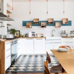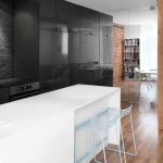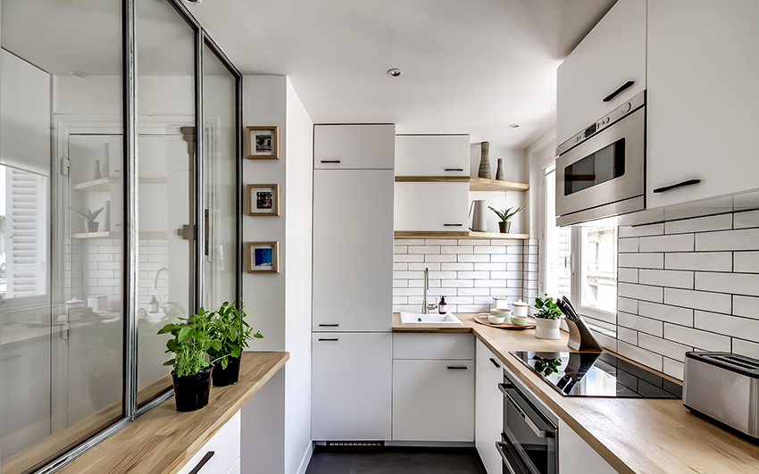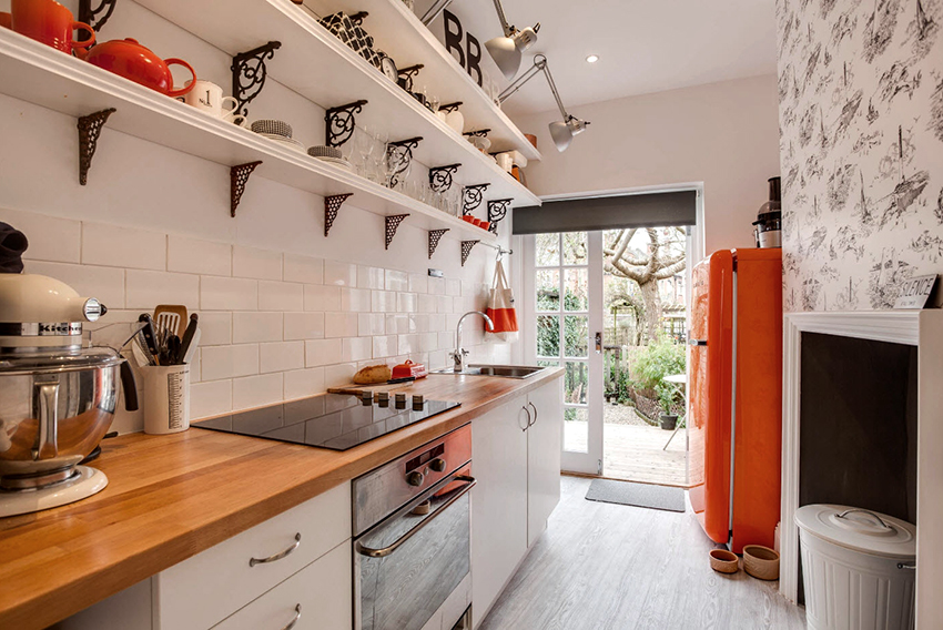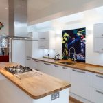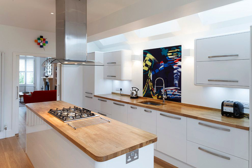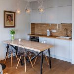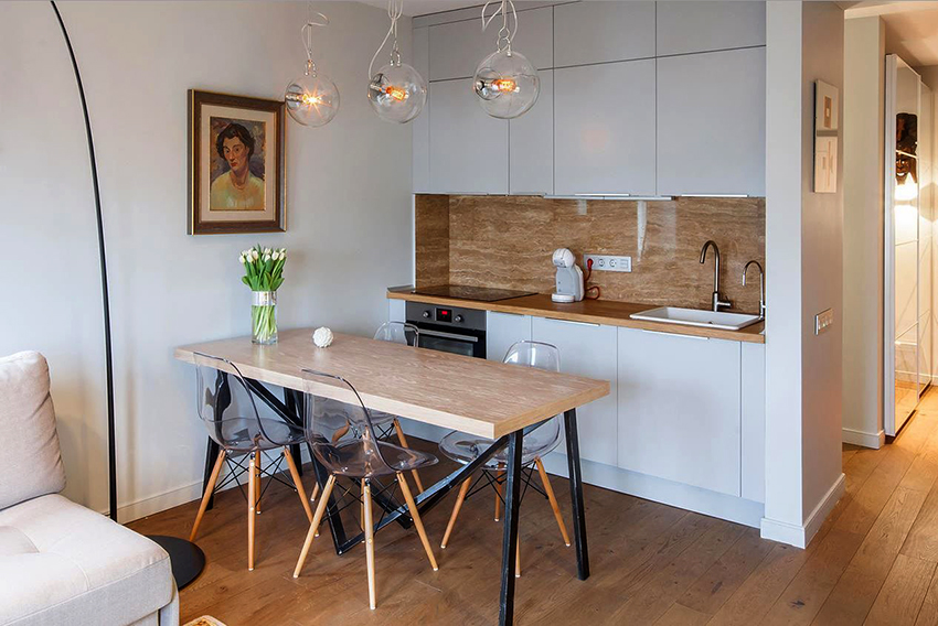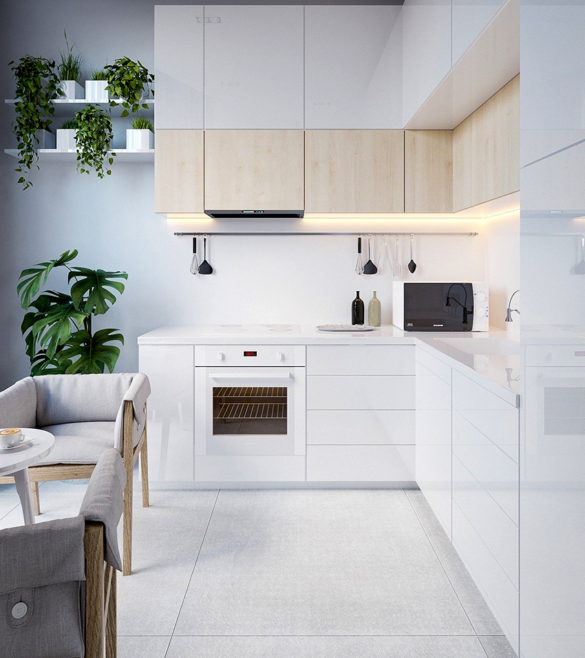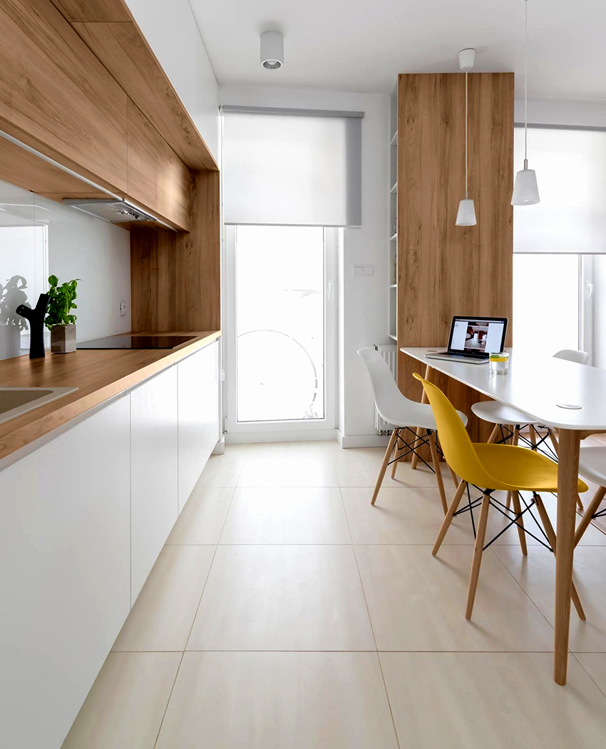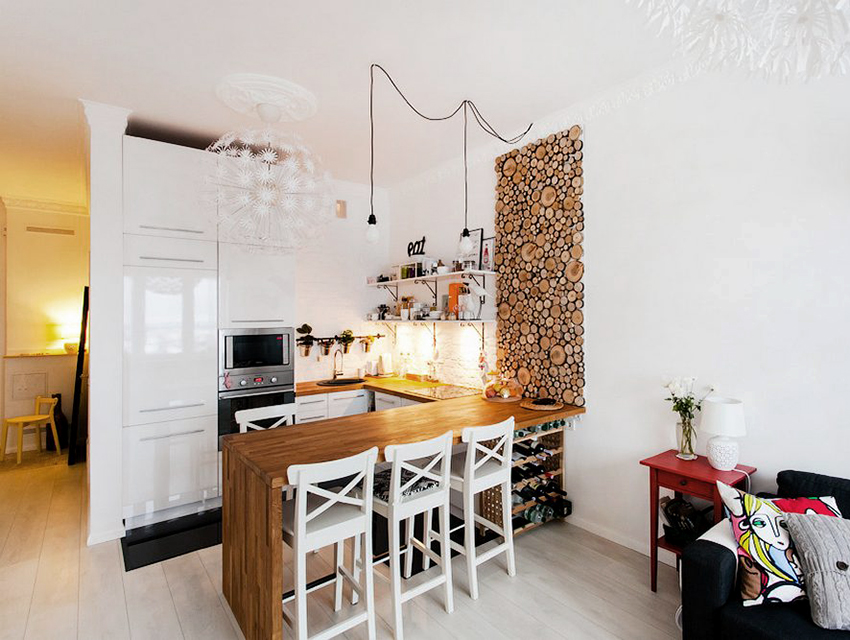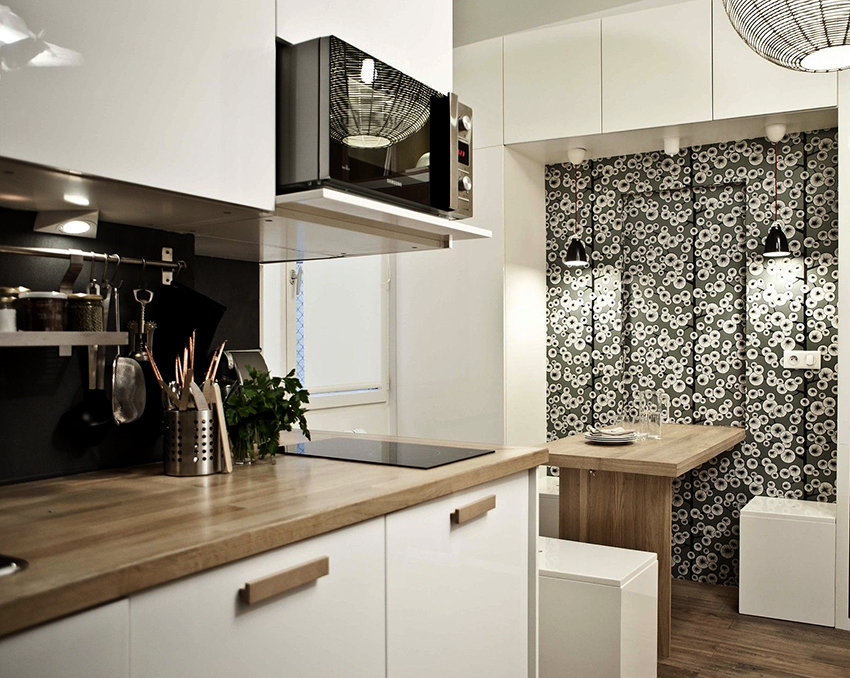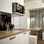 ซึ่งแตกต่างจากห้องครัวที่มีเคาน์เตอร์สีขาวบริสุทธิ์พื้นผิวลายไม้จะช่วยฟื้นฟูสภาพแวดล้อมที่เย็นและสีขาวได้อย่างมีนัยสำคัญ คุณสามารถนำอารมณ์ที่เหมาะสมมาสู่การตกแต่งภายในขึ้นอยู่กับฤดูกาลด้วยความช่วยเหลือของสำเนียงต่างๆ ชุดสีขาวพร้อมเคาน์เตอร์ไม้จะเข้ากับอพาร์ทเมนต์ขนาดเล็กหรือสตูดิโออพาร์ทเมนต์ได้อย่างสมบูรณ์แบบซึ่งท็อปครัวสีขาวจะเพิ่มพื้นที่ให้มากขึ้น