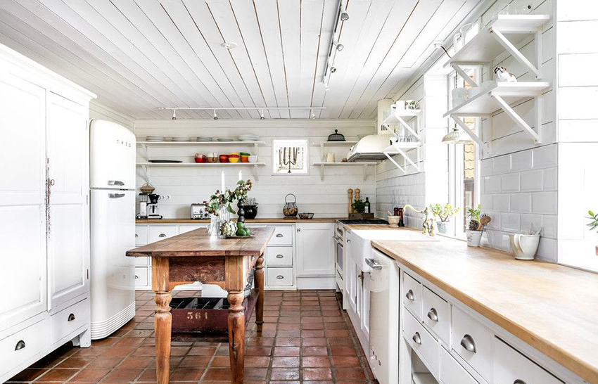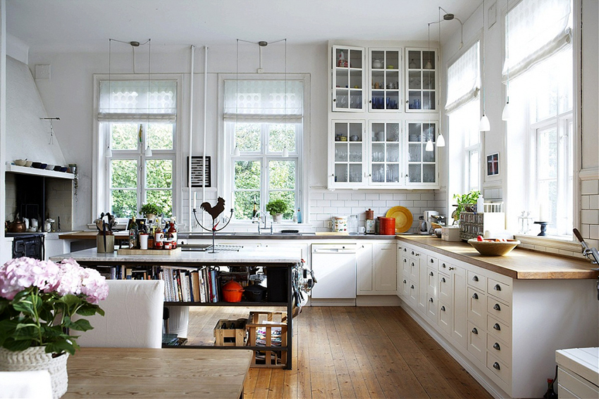 - เพลงลูกทุ่งถือเป็นสไตล์ชนบทล้วนๆ สีขาวในการตกแต่งภายในดังกล่าวทำหน้าที่เป็นพื้นหลังที่ยอดเยี่ยมที่ใช้สำหรับตกแต่งผนังโคมไฟและผ้าม่านสำหรับห้องครัวสีขาว