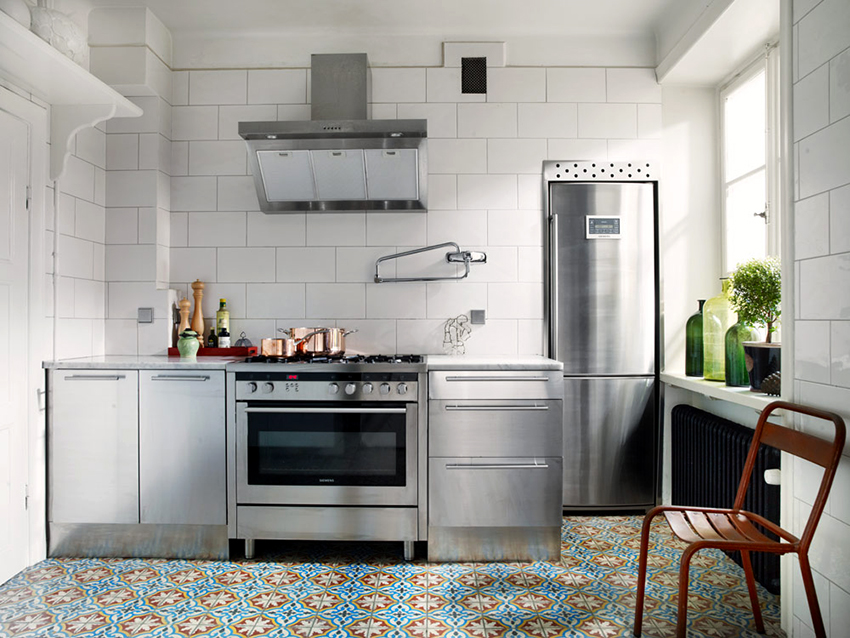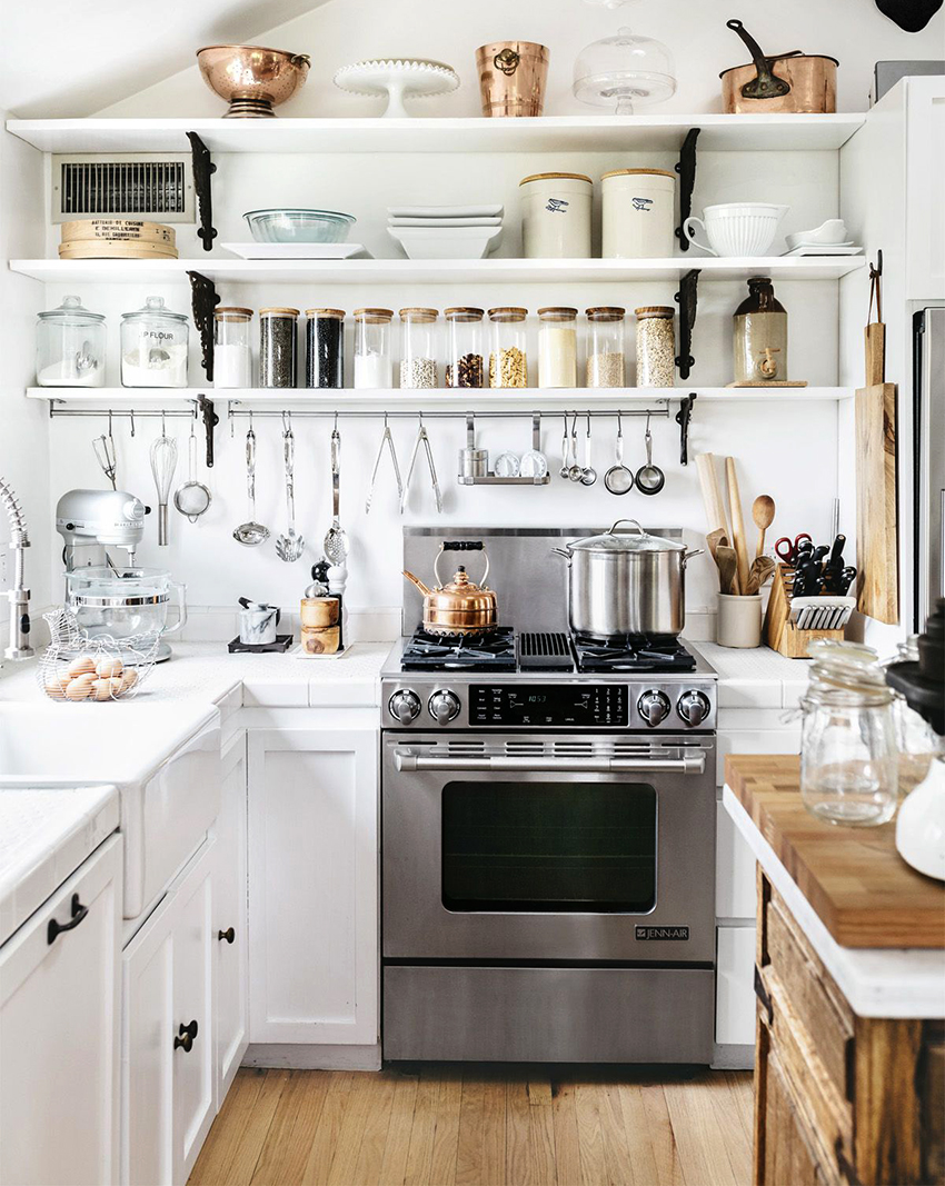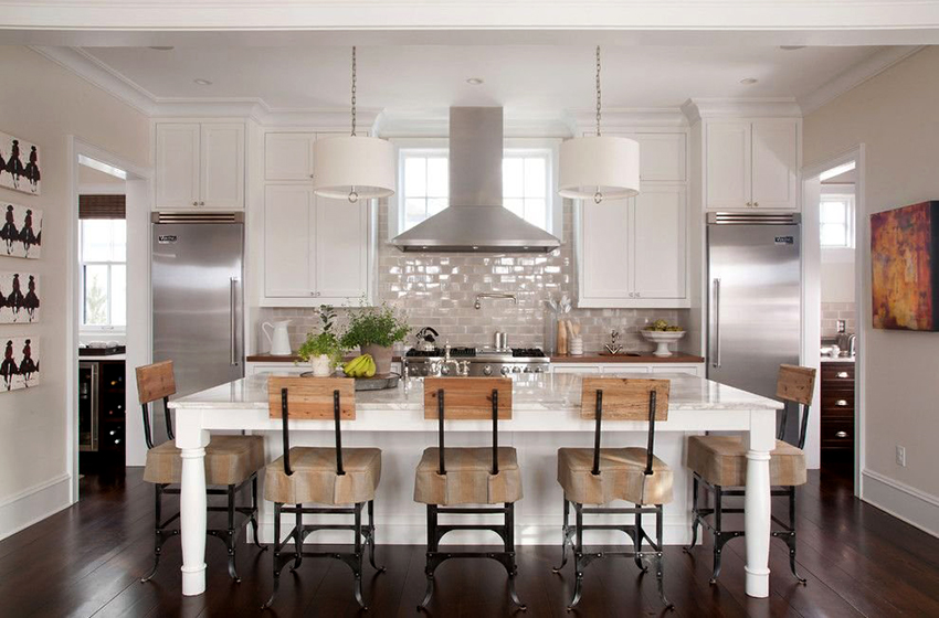 เครื่องใช้ในครัวสีเงินเป็นส่วนเสริมที่ยอดเยี่ยมสำหรับห้องครัวสีขาวที่มีส่วนประกอบของไม้ ดังนั้นวัสดุที่มีความเงาเล็กน้อยจะช่วยเพิ่มระดับแสงในห้องครัวขนาดเล็กสีเข้มที่มีเพดานต่ำ