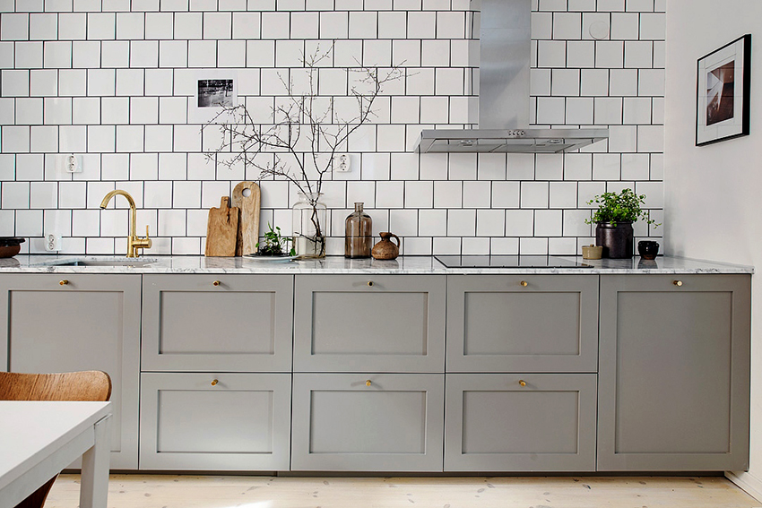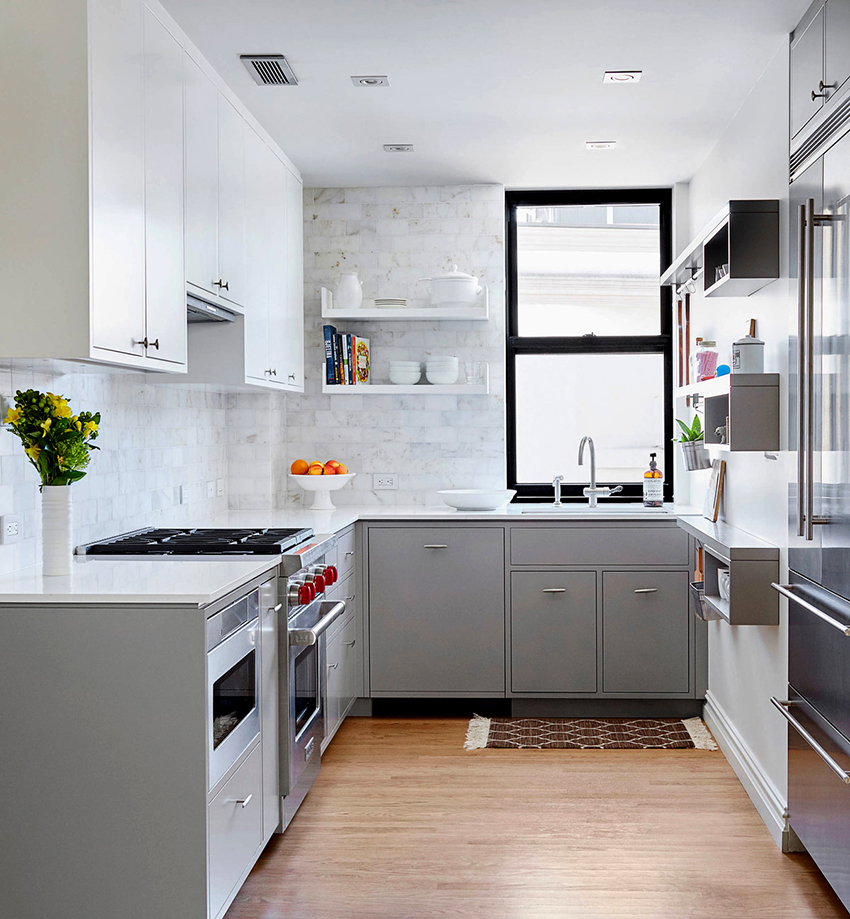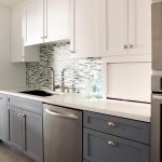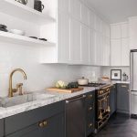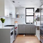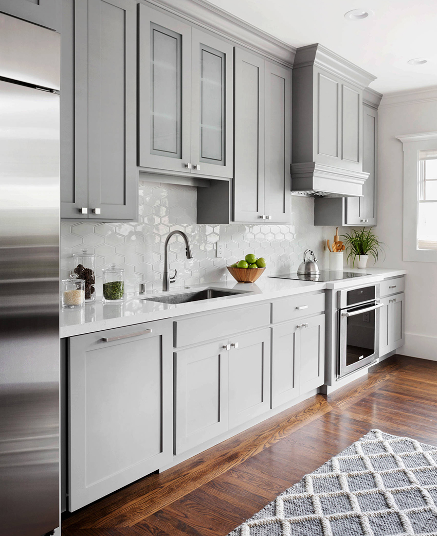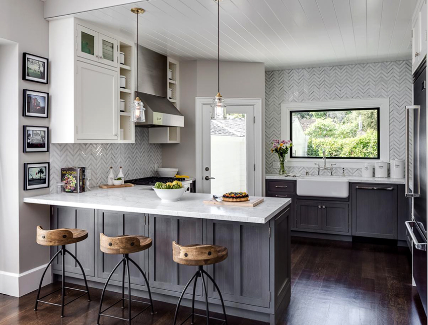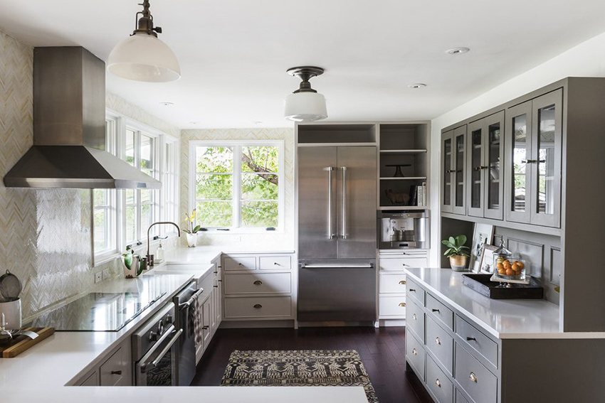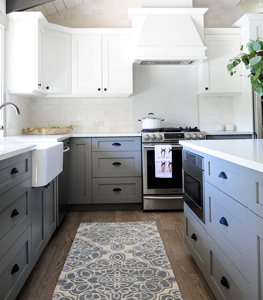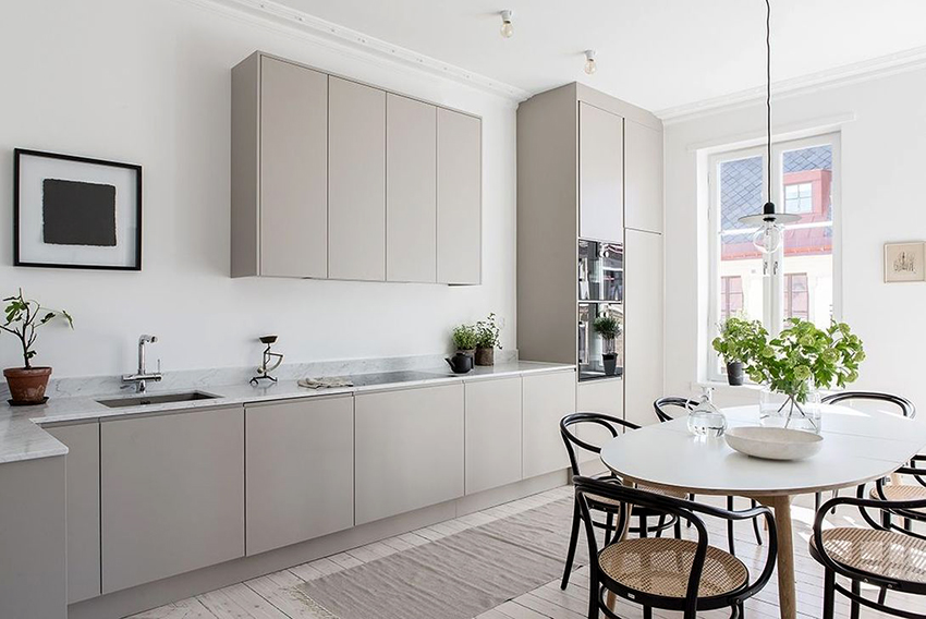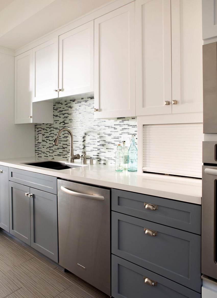 การผสมสองสีที่ได้รับความนิยมมากที่สุดคือสีขาวด้านบนและด้านล่างสีเทา การผสมผสานนี้มีข้อดีหลายประการที่ไม่อาจโต้แย้งได้เนื่องจากด้านล่างของห้องครัวมีความอ่อนไหวต่อสิ่งสกปรกมากกว่าซึ่งจะไม่โดดเด่นกับพื้นหลังสีเทา นอกจากนี้สีขาวจะช่วยให้ด้านบนดูกว้างขวางส่งผลให้ห้องครัวดูไม่เทอะทะราวกับว่าด้านบนเป็นสีเข้ม