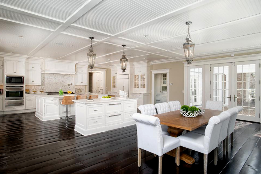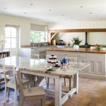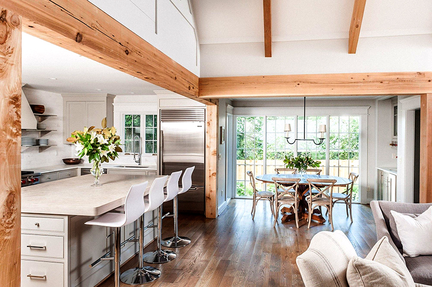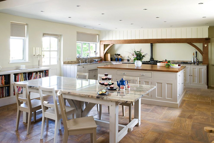 ห้องครัวไม้สีอ่อนที่มีรสนิยมจะสร้างความรู้สึกสดชื่นและกลมกลืน ตัวเลือกที่ได้รับความนิยมมากที่สุดสำหรับการออกแบบประเภทนี้คือการผสมผสานระหว่างชุดหูฟังสีขาวกับโต๊ะผ้ากันเปื้อนและพื้นไม้ ห้องครัวสีขาวและไม้นี้ค่อนข้างกว้างขวางและมีสไตล์ ในห้องครัวของบ้านในชนบทคานไม้มีความเหมาะสมสอดคล้องกับพื้นซึ่งสอดคล้องกับสไตล์ภูเขาที่สงบและเงียบสงบของชาเล่ต์