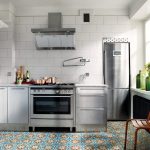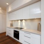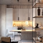 เทรนด์แฟชั่นล่าสุดในห้องครัวในรูปแบบที่ทันสมัยคือผอม ผนังเรียบๆสีสดใสหรือพื้นผิวที่มีทิวทัศน์หรือมีรูปถ่ายผักและผลไม้เป็นตัวเลือกที่ยอดเยี่ยมสำหรับผ้ากันเปื้อนสำหรับห้องครัวสีขาวมันวาวแม้ว่าเคาน์เตอร์จะเป็นสีขาวก็ตาม การออกแบบดังกล่าวเหมาะสมกับความเรียบง่ายและความทันสมัยและภาพวาดที่เลียนแบบไม้หรืออิฐจะดูดีในห้องใต้หลังคาในเมือง ในรูปแบบที่ทันสมัยโลหะสีเทาดูดีบนผนังการทำงานในรูปแบบของการเคลือบลายนูน