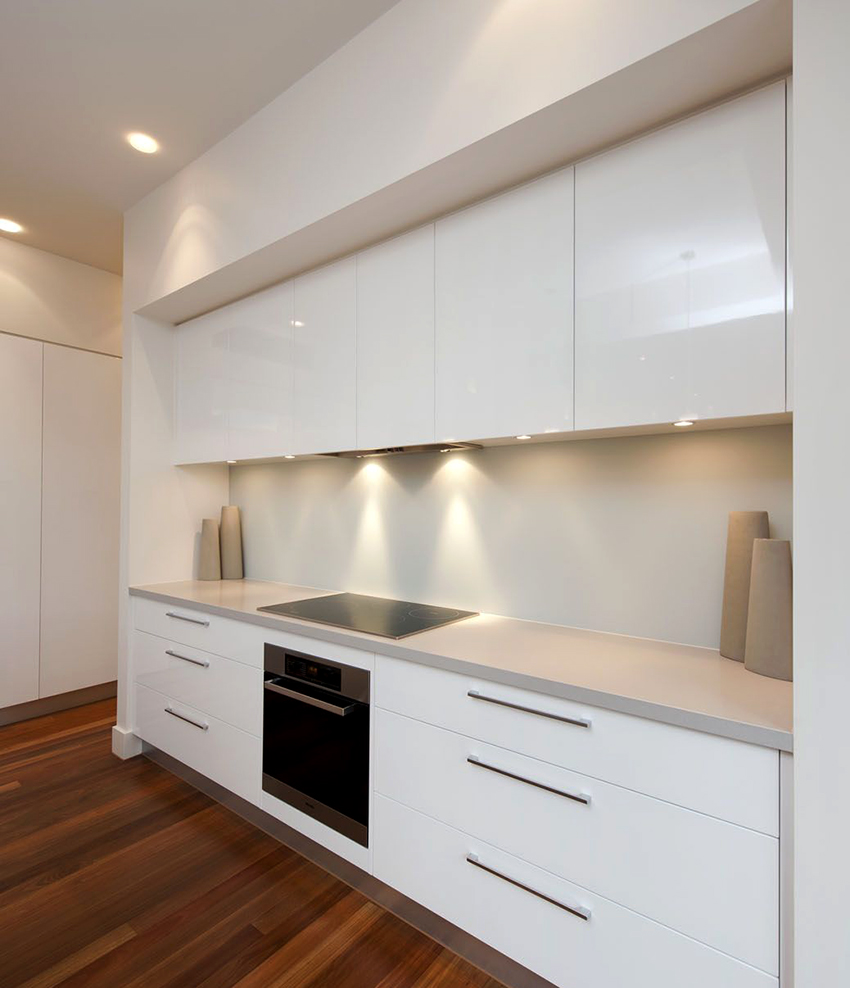 - ห้องครัวสีขาวนำความสะอาดความเคร่งขรึมและความสง่างามมาสู่สถานที่สร้างสภาพแวดล้อมพื้นฐานและเงียบสงบ