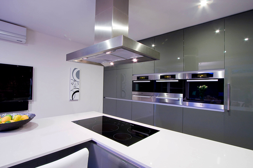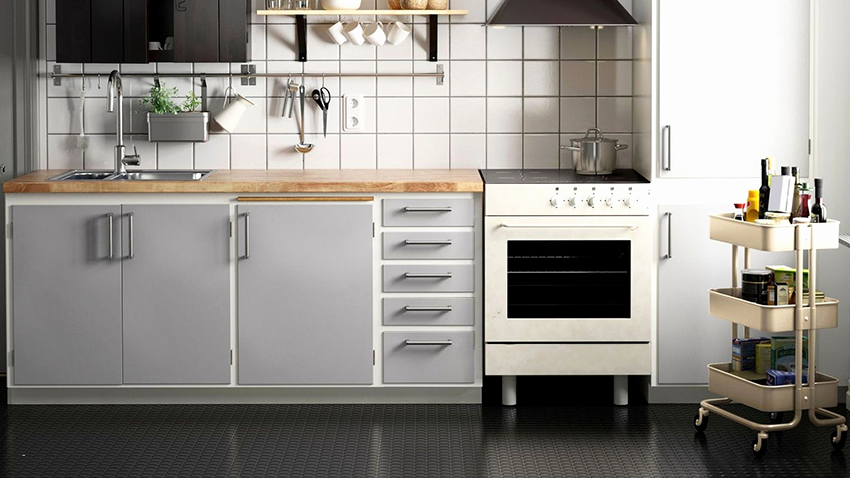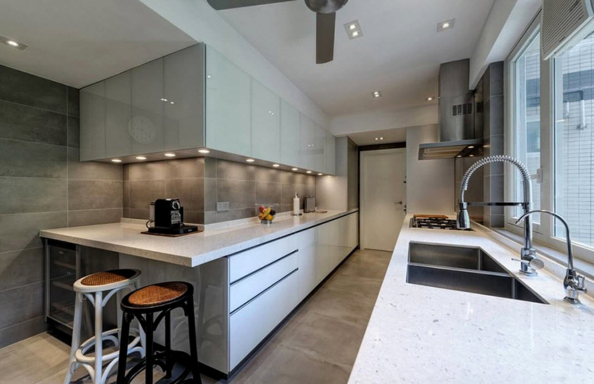 สามารถใช้เป็นพื้นหลังในการออกแบบห้องครัวสีเทาและสีขาวได้อย่างปลอดภัย ภาพถ่ายแสดงให้เห็นอย่างชัดเจนว่าชุดสีขาวดูดีเพียงใดเมื่อเทียบกับพื้นหลังสีเทาผนังและเพดาน