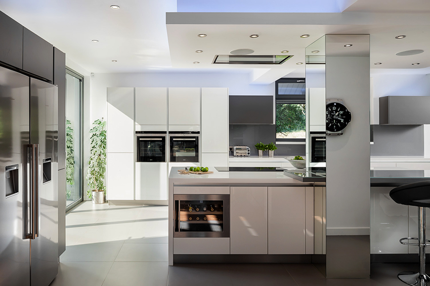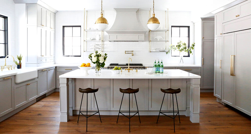 ความสง่างามที่ยับยั้งชั่งใจของห้องครัวสีขาวและสีเทา: ภาพถ่ายของการตกแต่งภายใน
