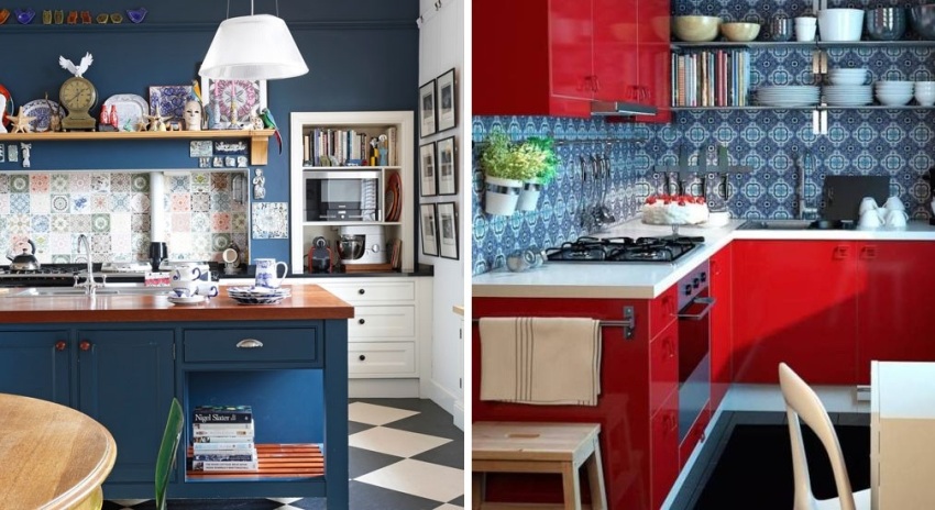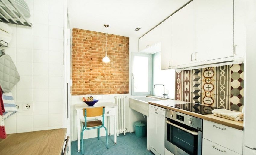 องค์ประกอบที่สดใสในรูปแบบของอิฐแทรกและผ้ากันเปื้อนที่มีแรงจูงใจด้านชาติพันธุ์จะเจือจางการตกแต่งภายในที่น่าเบื่อหน่าย