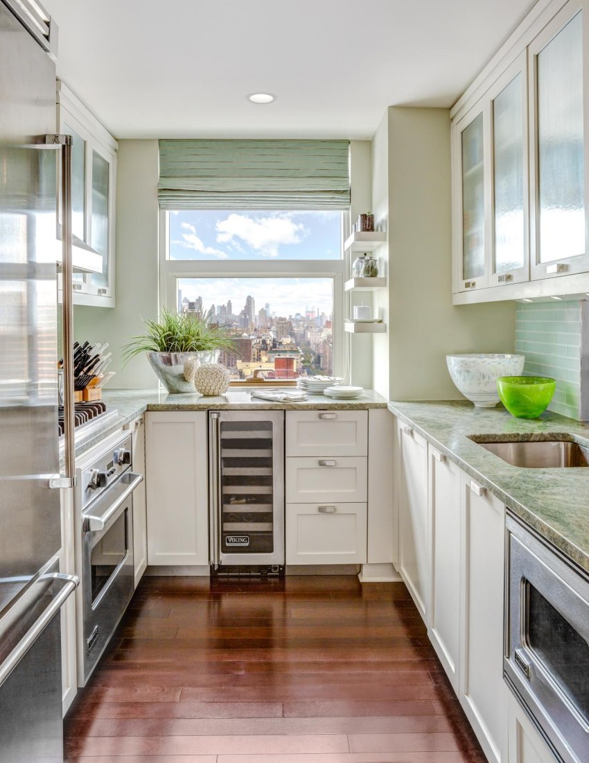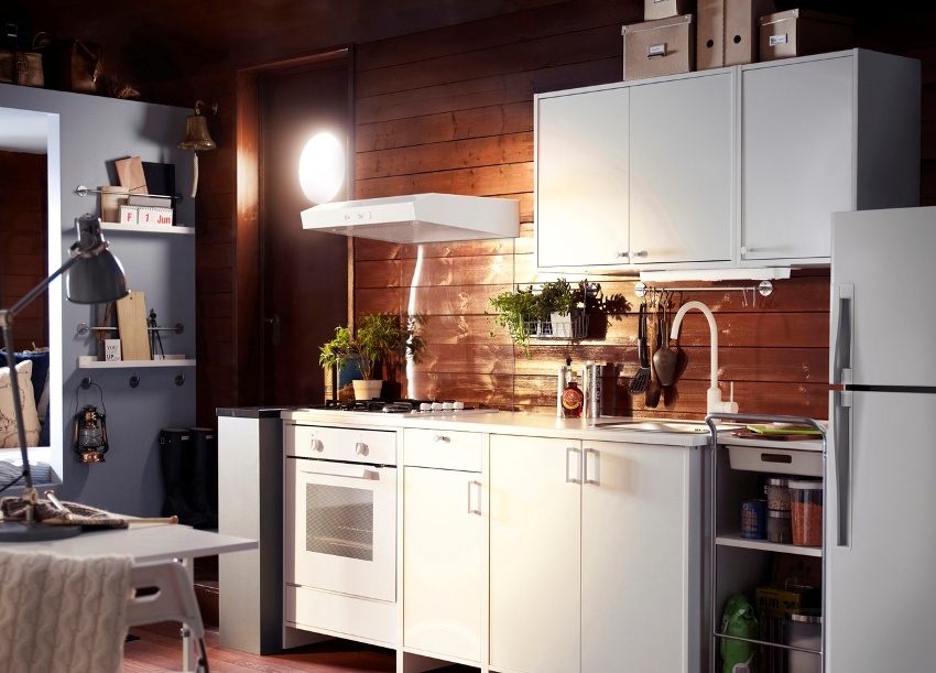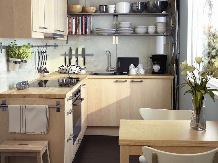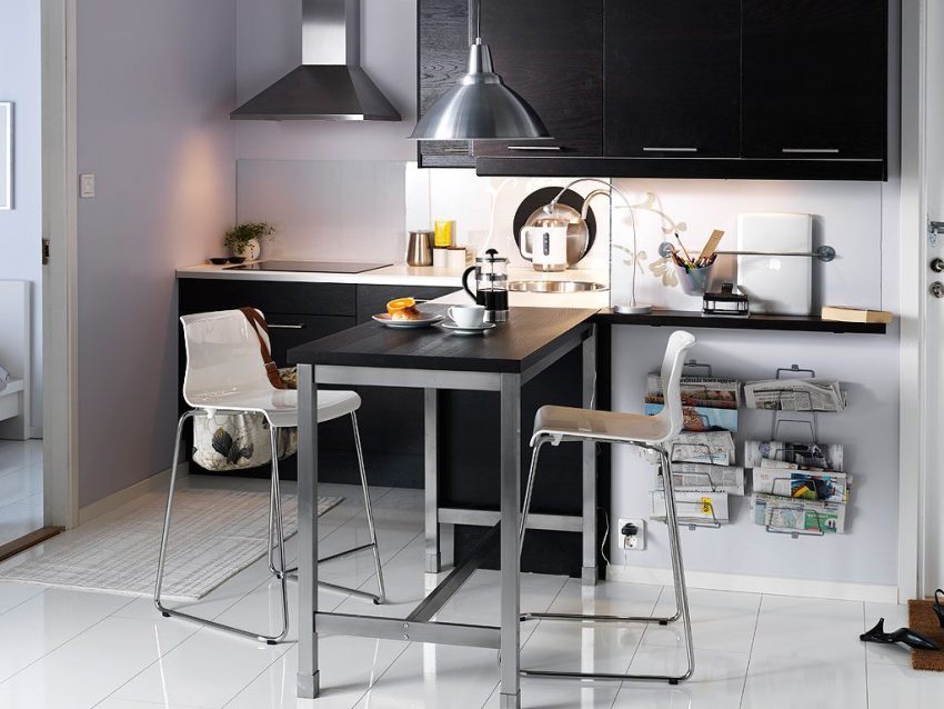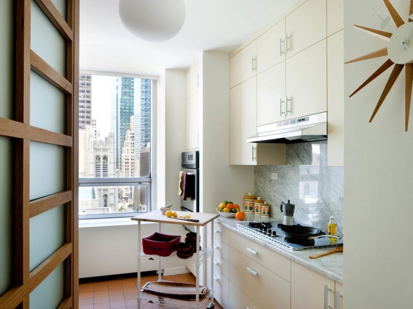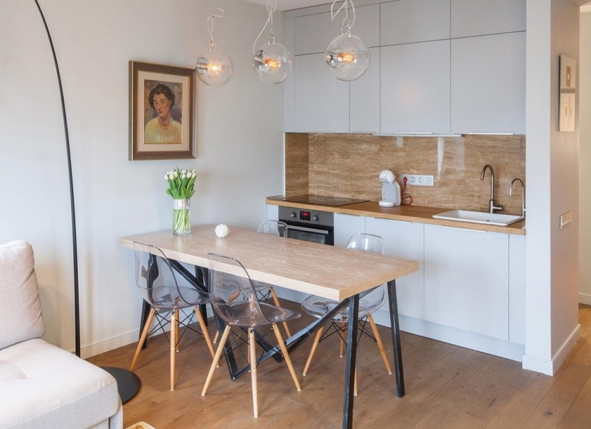 คุณสามารถเพิ่มพื้นที่ห้องครัวได้อย่างมากโดยการรวมห้องกับห้องนั่งเล่นหรือทางเดิน ดังนั้นคุณสามารถย้ายพื้นที่รับประทานอาหารออกไปนอกห้องครัวหรือจัดให้อยู่ในรูปแบบของเคาน์เตอร์บาร์ซึ่งจะทำให้ห้องครัวและห้องนั่งเล่นแบ่งออกเป็นสัดส่วน อย่างไรก็ตามวิธีแก้ปัญหานี้มีข้อเสีย - การแพร่กระจายของกลิ่นระหว่างการปรุงอาหารซึ่งผู้อยู่อาศัยในอพาร์ทเมนต์บางคนไม่สามารถยอมรับได้ นอกจากนี้ความไม่สะดวกบางประการจากเสียงรบกวนในห้องครัวจะถูกส่งไปหากอพาร์ตเมนต์มีขนาดเล็กและมีคนพักผ่อนอยู่ในห้องนั่งเล่นในเวลานี้
