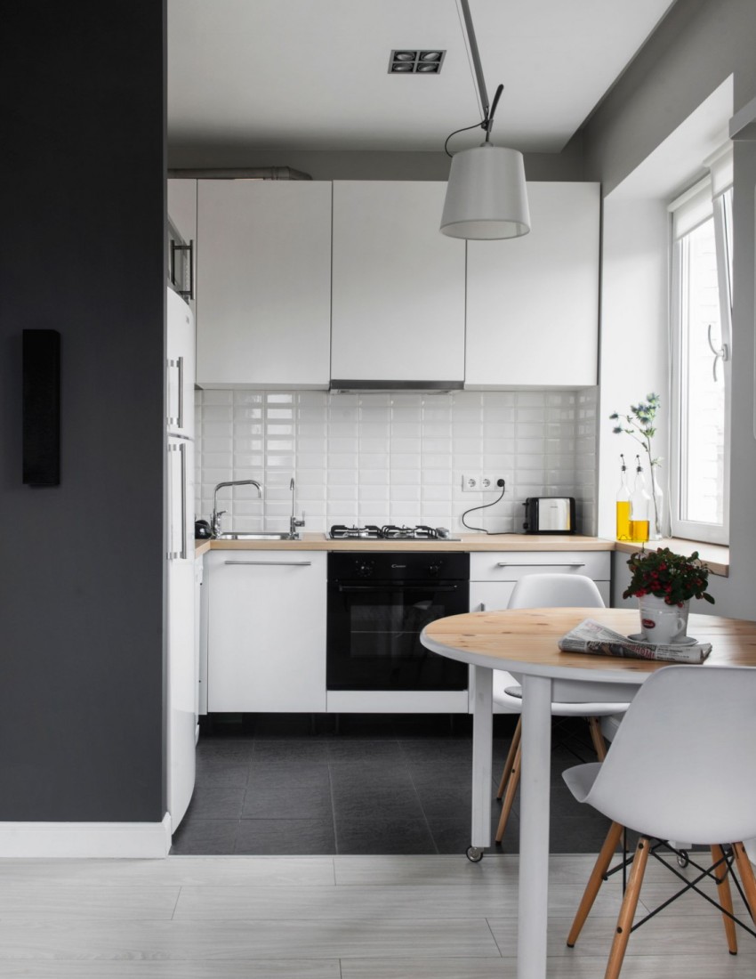 สไตล์สแกนดิเนเวียมักใช้ในห้องครัวขนาดเล็ก มีการใช้โทนสีที่สุขุมเจือจางเล็กน้อยด้วยลวดลายต่าง ๆ เฟอร์นิเจอร์ไม้พอประมาณเครื่องใช้เหล็กและสิ่งทอแบบชนบทสำหรับตกแต่ง หากคุณต้องการทำให้การตกแต่งภายในมีสไตล์มากขึ้นให้เพิ่มสีสันด้วยเครื่องใช้ในครัวที่สดใส ใช้จานแปลก ๆ ที่มีลวดลายน่ารักเครื่องปั่นพริกไทยที่มีรูปร่างน่าสนใจและเครื่องปั่นเกลือหรือที่ใส่หม้อในรูปแบบหน้าตาตลก ๆ