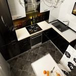 จะดีกว่าถ้าเลือกเฟอร์นิเจอร์ที่มีสีอ่อนแล้วมันจะดูเล็กกว่า ตัวเลือกที่น่าสนใจคือใช้สองเฉดสี: สีเข้มกว่าบนตู้ล่างและสีอ่อนที่ด้านบน องค์ประกอบกระจกจะดูได้เปรียบที่ตู้ด้านบนพวกมันจะสะท้อนและกระจายรังสีดวงอาทิตย์และสร้างบรรยากาศที่น่ารื่นรมย์ ที่ด้านล่างของชุดหูฟังมุมครัวใน Khrushchev จะไม่สามารถใช้การตกแต่งดังกล่าวได้จริง