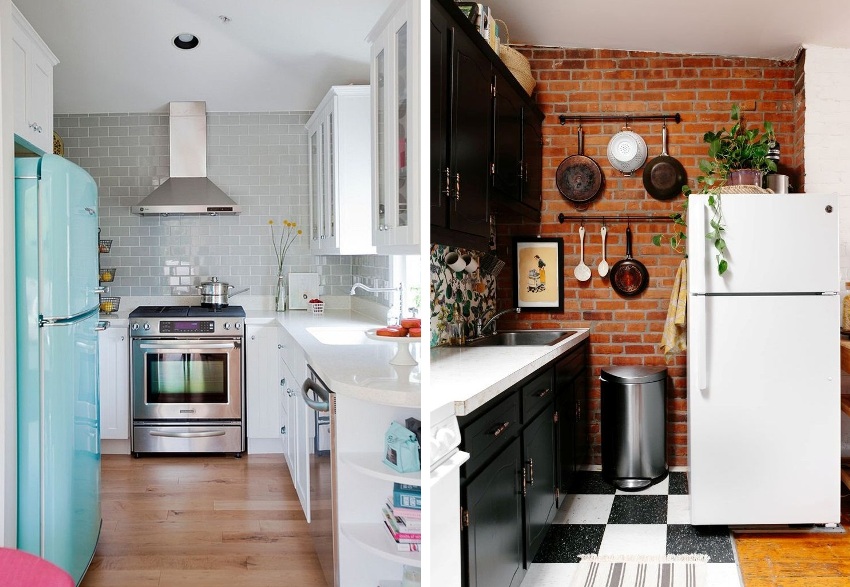 ปัญหาสำคัญของห้องครัวใน Brezhnevka หรือ Khrushchev คือการหาสถานที่สำหรับ ตู้เย็น... หากมีขนาดเล็กคุณสามารถวางไว้บนโต๊ะข้างเตียงของชุดหูฟังได้จากนั้นพื้นที่จะถูกใช้จนถึงเพดาน อุปกรณ์พิเศษ - ระบบจัดเก็บข้อมูลจะช่วยเติมเต็มพื้นที่ในตู้ด้วยความช่วยเหลือของพวกเขามันจะง่ายต่อการจัดระเบียบและวางของให้เป็นระเบียบ
