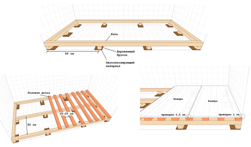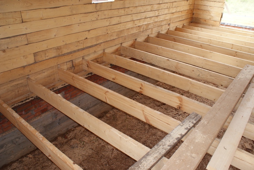 ในขั้นตอนแรกของงานตกแต่งพื้นจะถูกสร้างขึ้น สำหรับสิ่งนี้ท่อนไม้จะถูกวางตามคานแบริ่งของโครงขื่อ องค์ประกอบเหล่านี้วางทีละ 50 ซม. ขอแนะนำให้ใช้ตะปูเพื่อแก้ไข