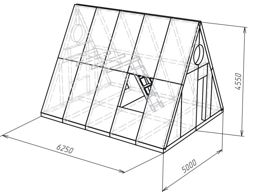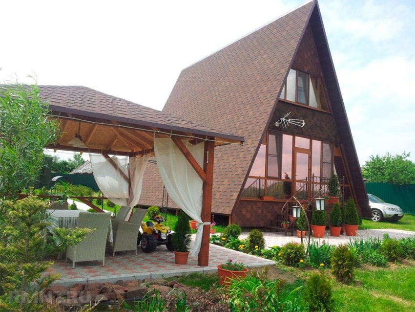 โครงสร้างสามเหลี่ยมนั้นค่อนข้างง่ายในการประกอบดังนั้นเจ้าของกระท่อมฤดูร้อนสามารถนำโครงการบ้านกรอบที่สวยงามมาสู่ชีวิตได้ด้วยมือของพวกเขาเอง