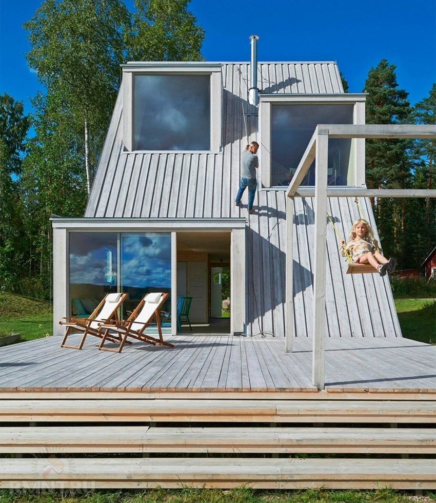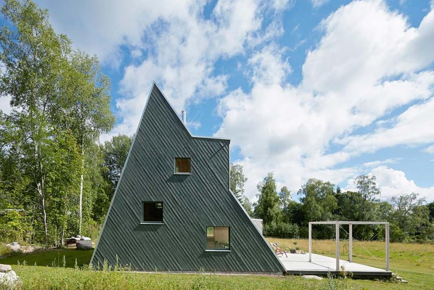 อาคารรูปสามเหลี่ยมช่วยให้คุณประหยัดพื้นที่ว่างบนที่ดินขนาดเล็ก บนเครือข่ายคุณสามารถค้นหาโครงการบ้านสำเร็จรูปจำนวนมากบนพื้นที่ 6 เอเคอร์ที่มีขนาดกะทัดรัดซึ่งเหมาะสำหรับการอยู่อาศัยชั่วคราวในประเทศ เนื่องจากโครงสร้างของพวกเขาโครงสร้างในรูปแบบของกระท่อมจึงให้ร่มเงาน้อยที่สุดซึ่งเป็นข้อได้เปรียบหากปลูกต้นไม้ที่ชอบแสงบนพื้นที่